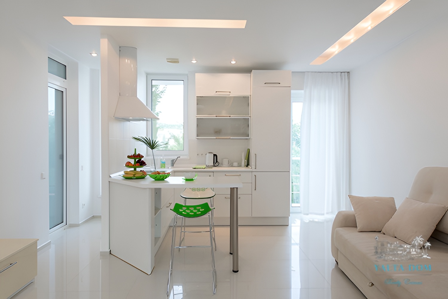 Просторные двухэтажные апартаменты (60 м2) с панорамными окнами и видом на море, балконом, кухней и двумя санузлами, идеально подойдут для проживания компании из 4 человек (1 большая двухспальная кровать, 1 диван-кровать) или семьи с детьми.