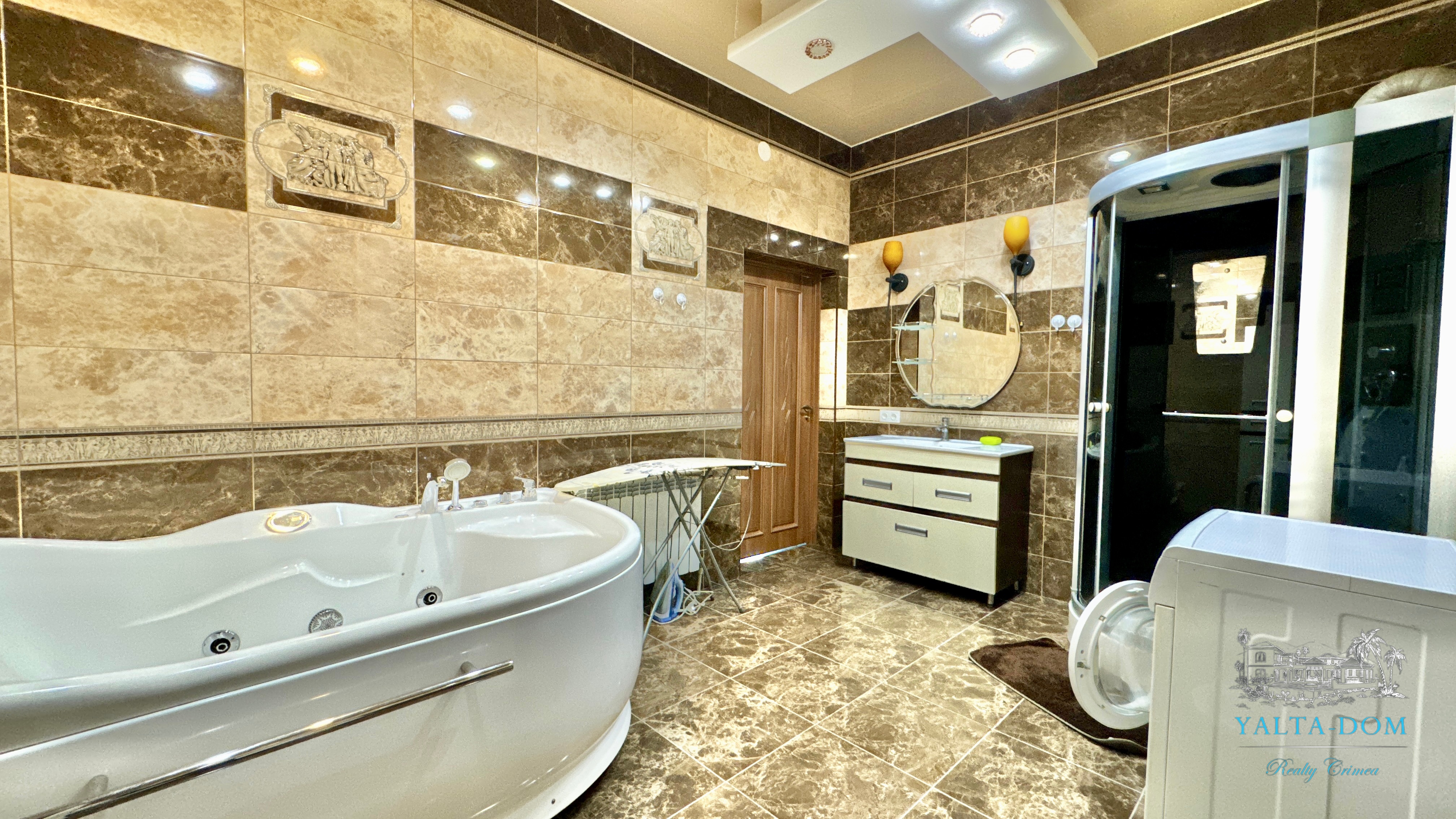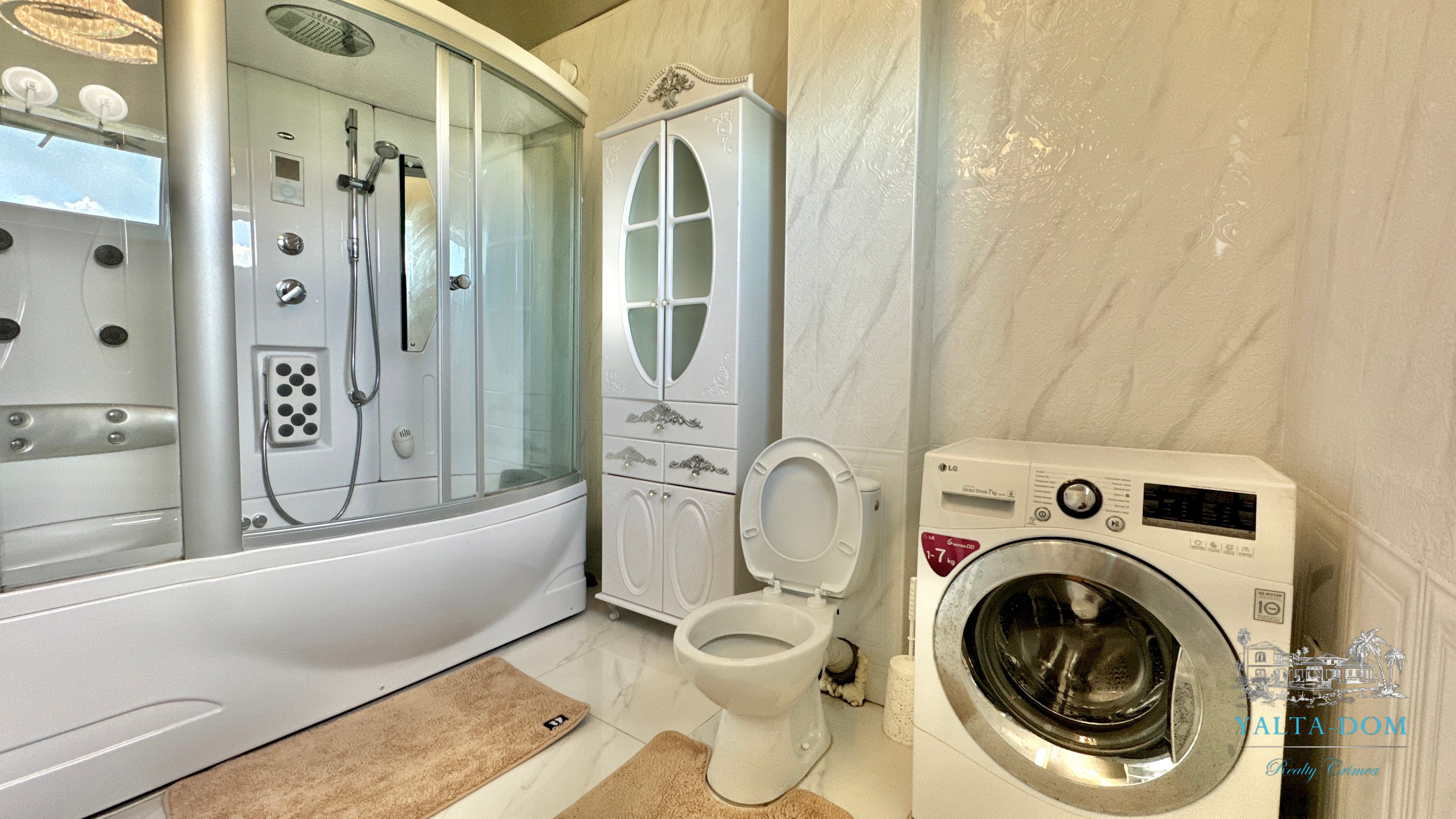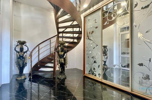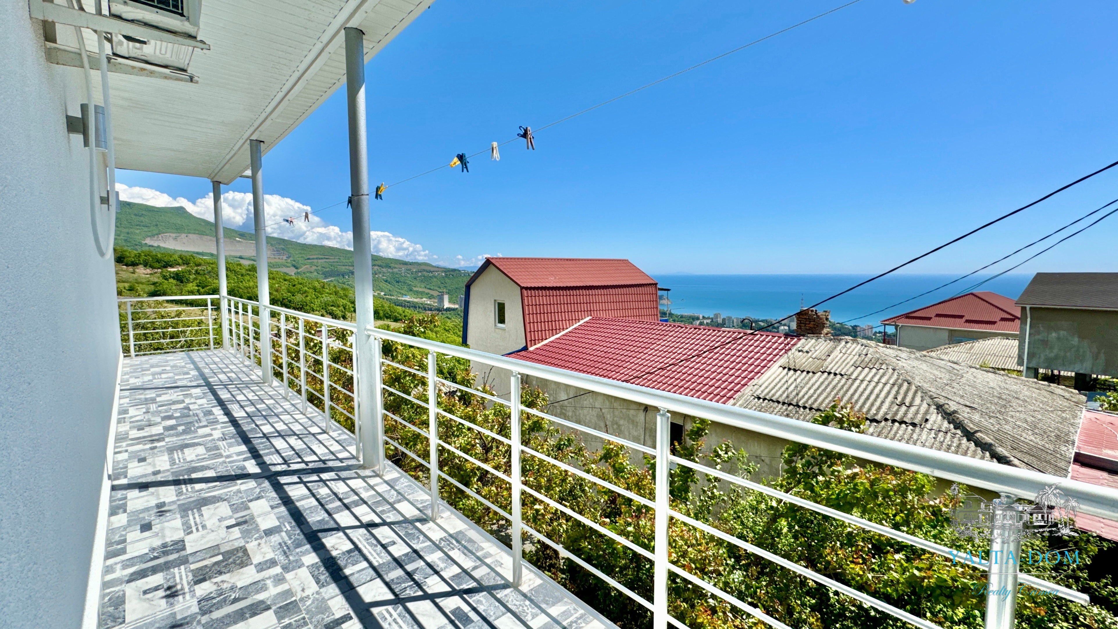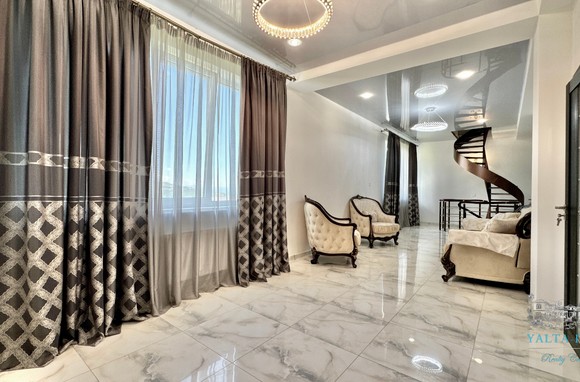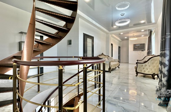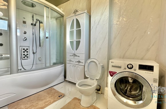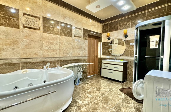 Второй этаж: холл, четыре спальни, с двухспальными кроватями, выход из каждой спальни на открытую террасу с видом на море и горы. Совмещенный санузел с гидромассажной кабиной, стиральной машинкой