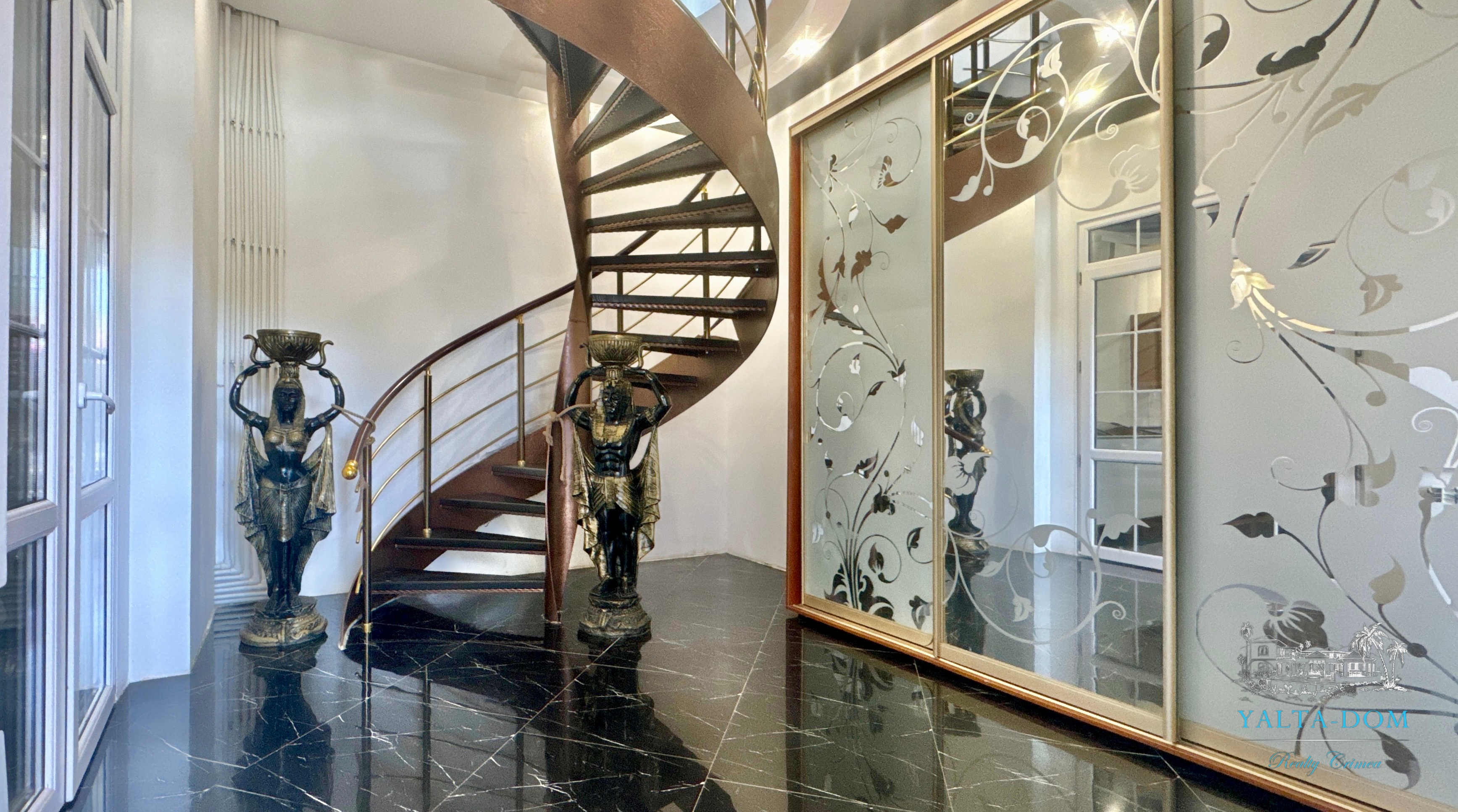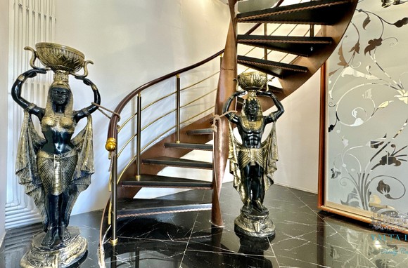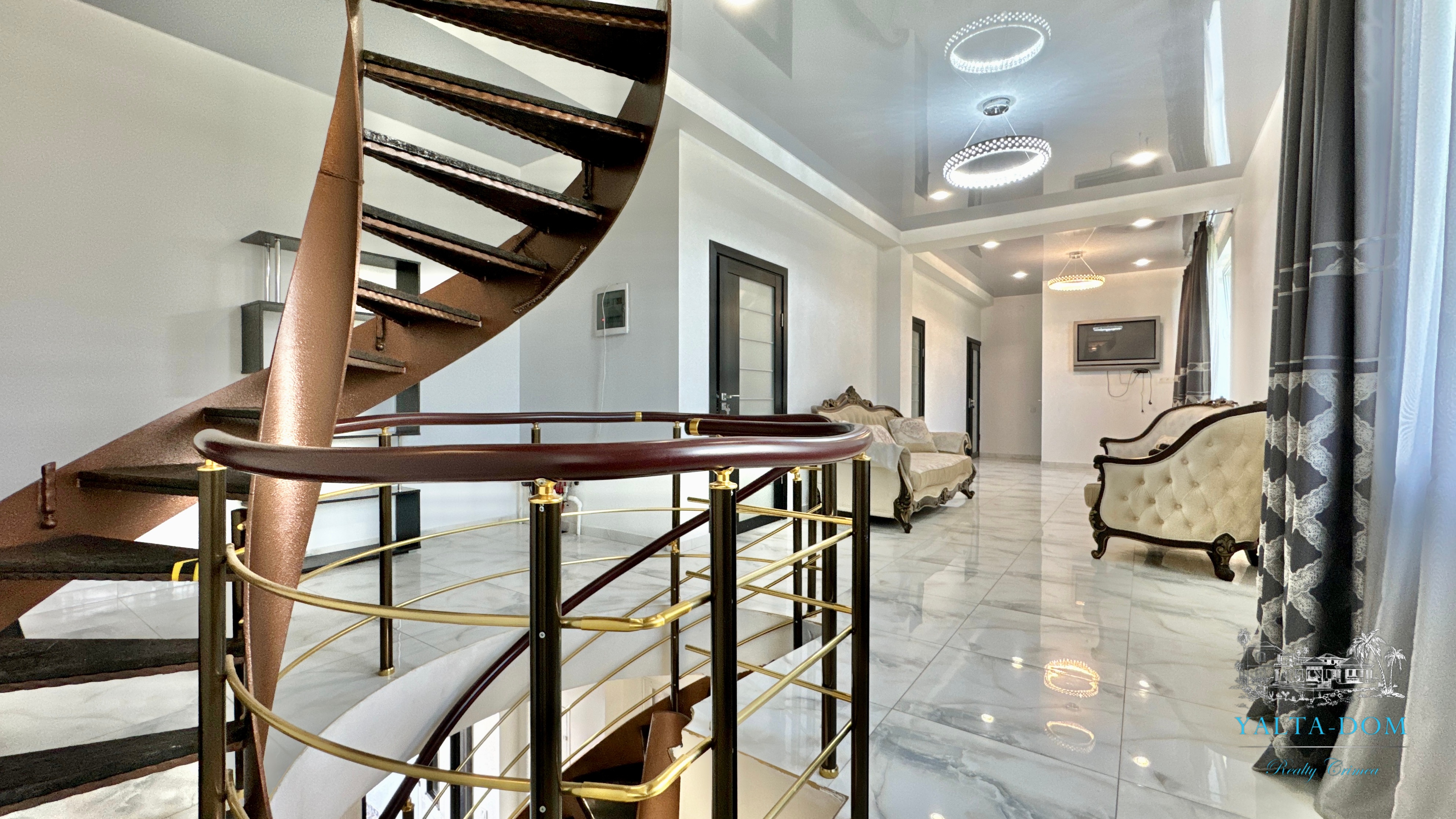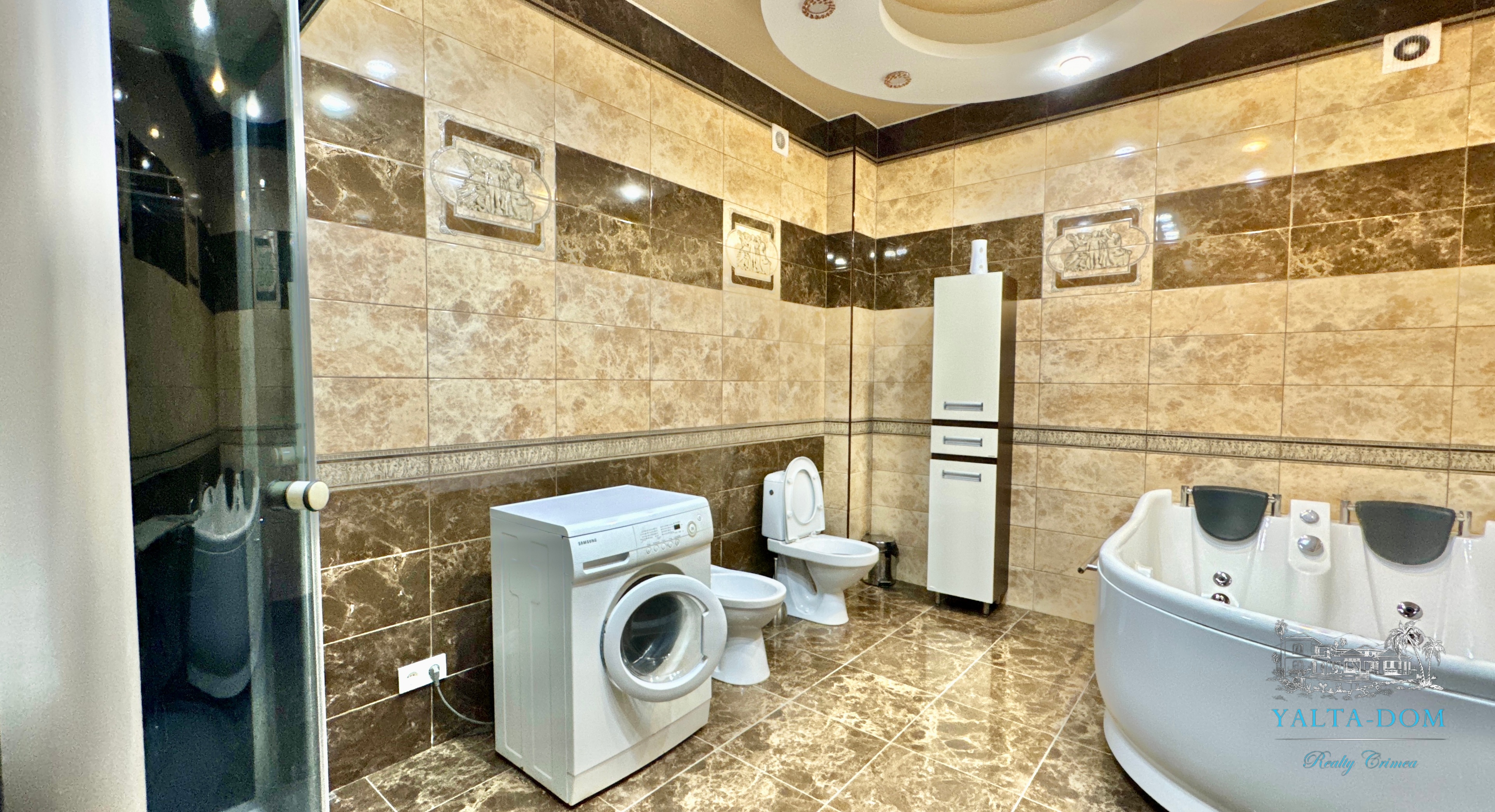 Второй этаж: холл, четыре спальни, с двухспальными кроватями, выход из каждой спальни на открытую террасу с видом на море и горы. Совмещенный санузел с гидромассажной кабиной, стиральной машинкой