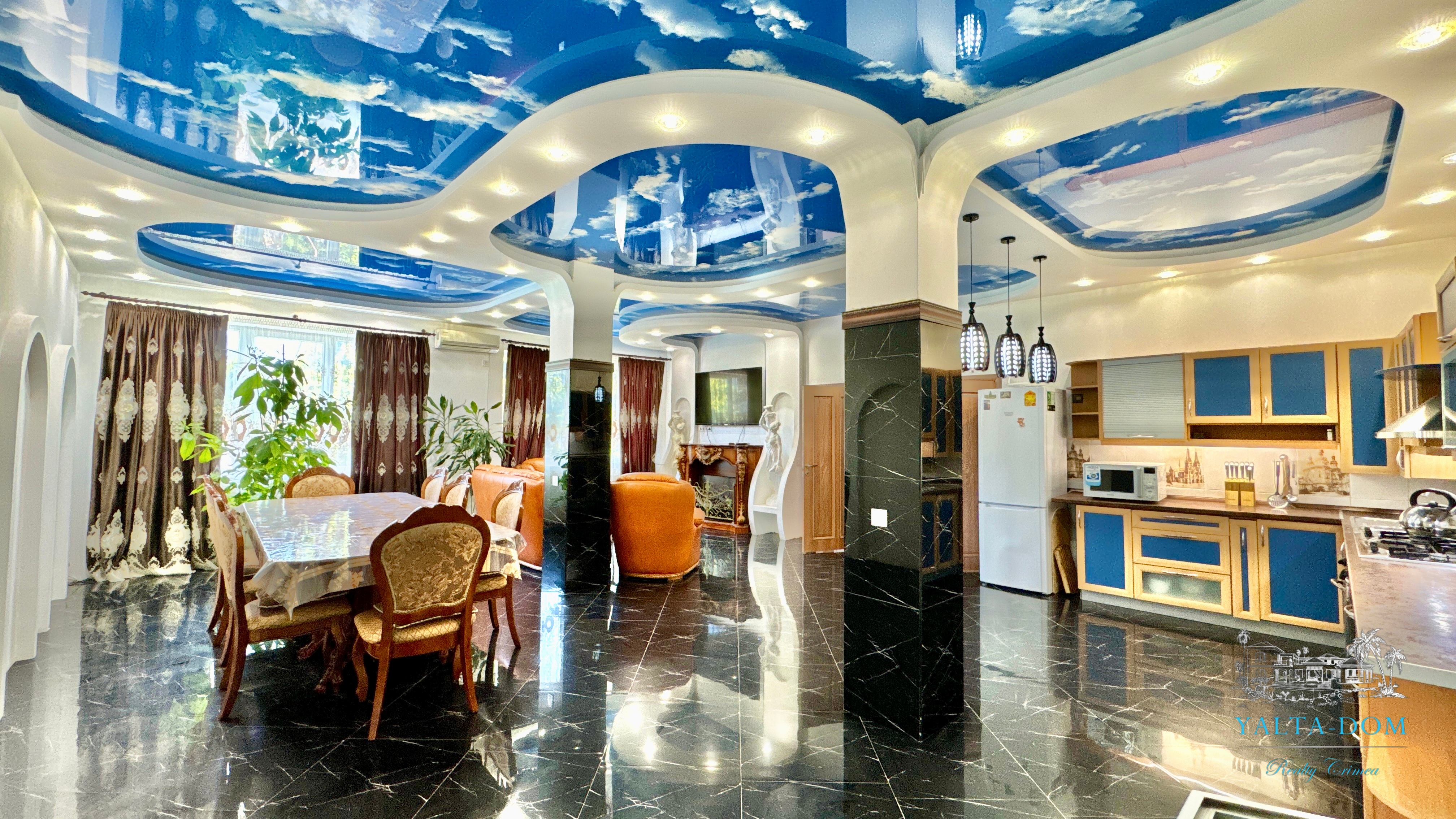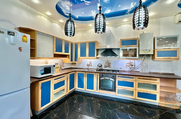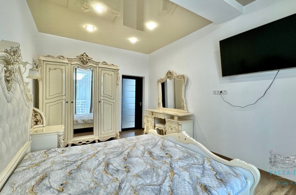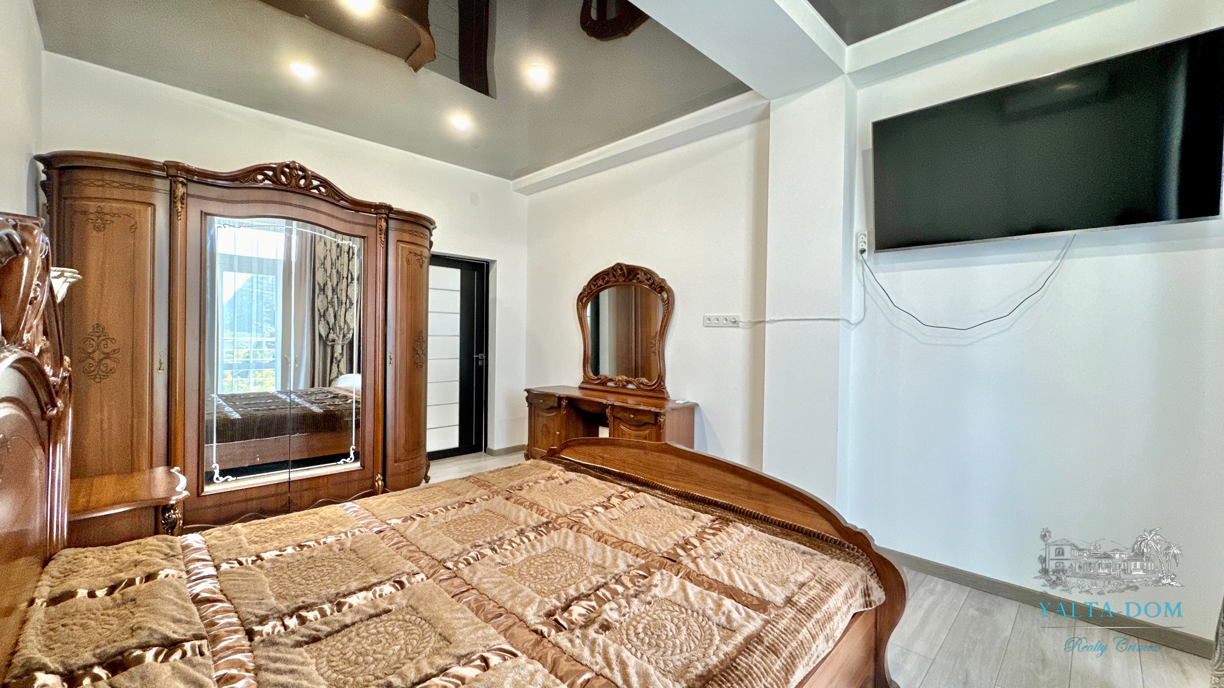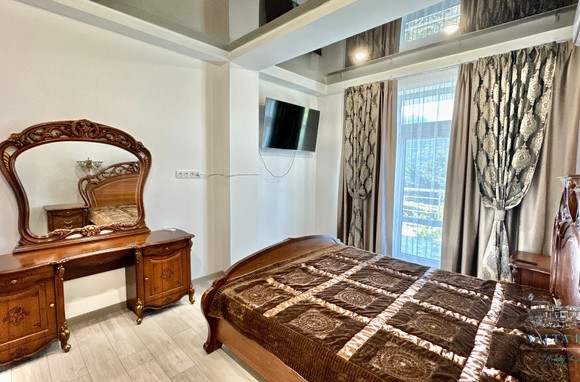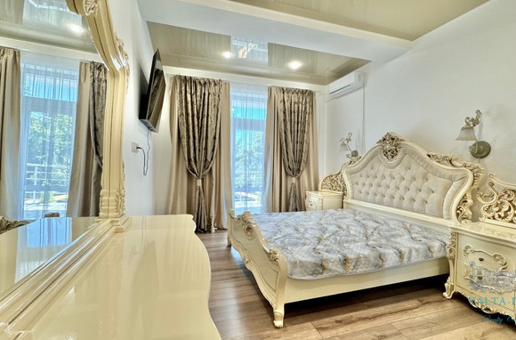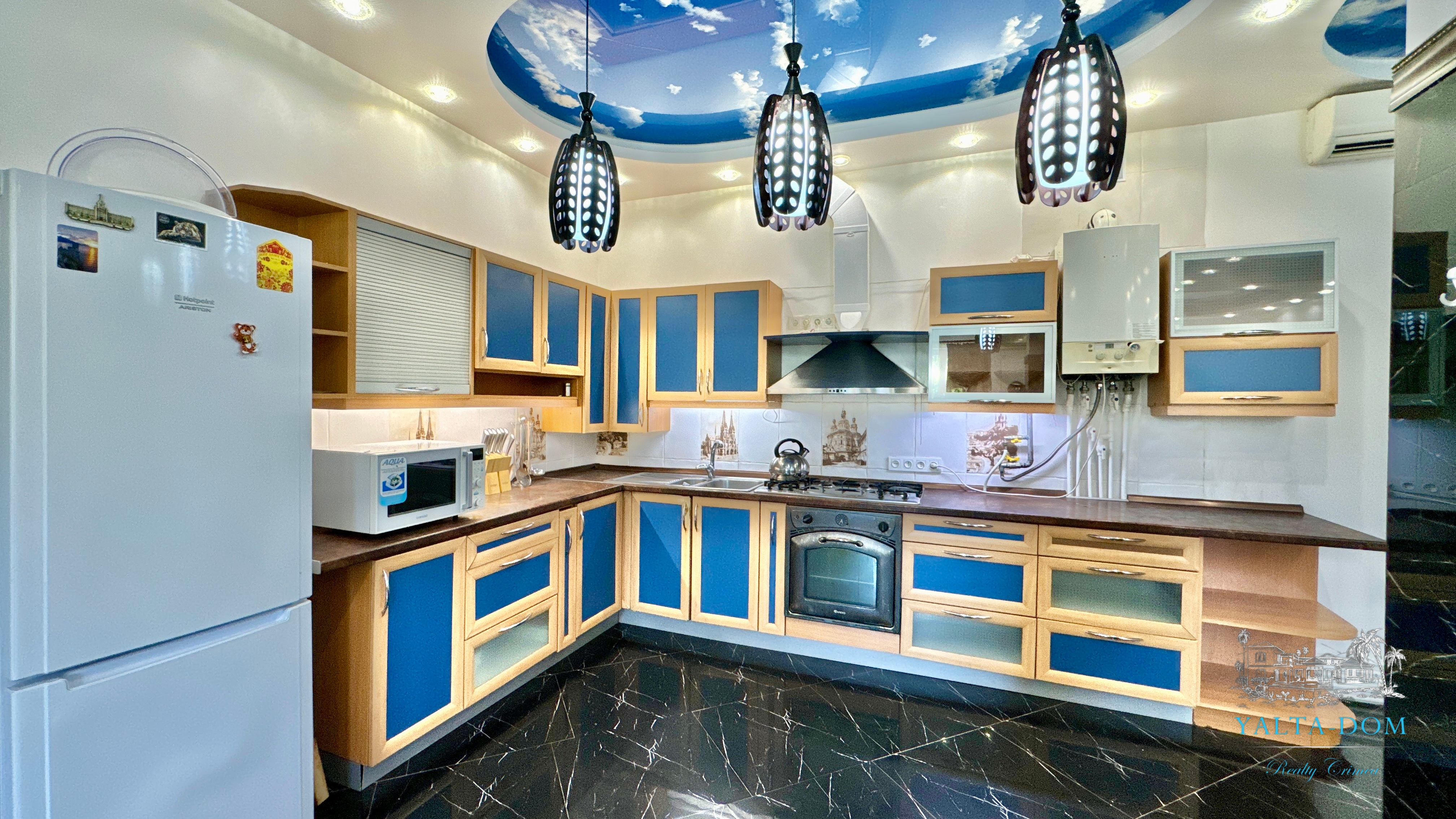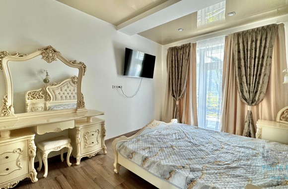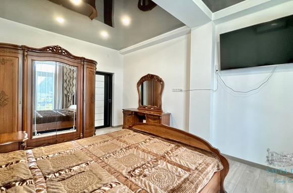 В доме, просторная кухня-гостиная, пять спален с двухспальными кроватями, TV и кондиционеры в каждой комнате; на втором этаже, выход из каждой спальни на открытую террасу с видом на море и горы. На кухне – полный комплект техники и посуды: микроволновая печь, газовая плита, духовка, холодильник.