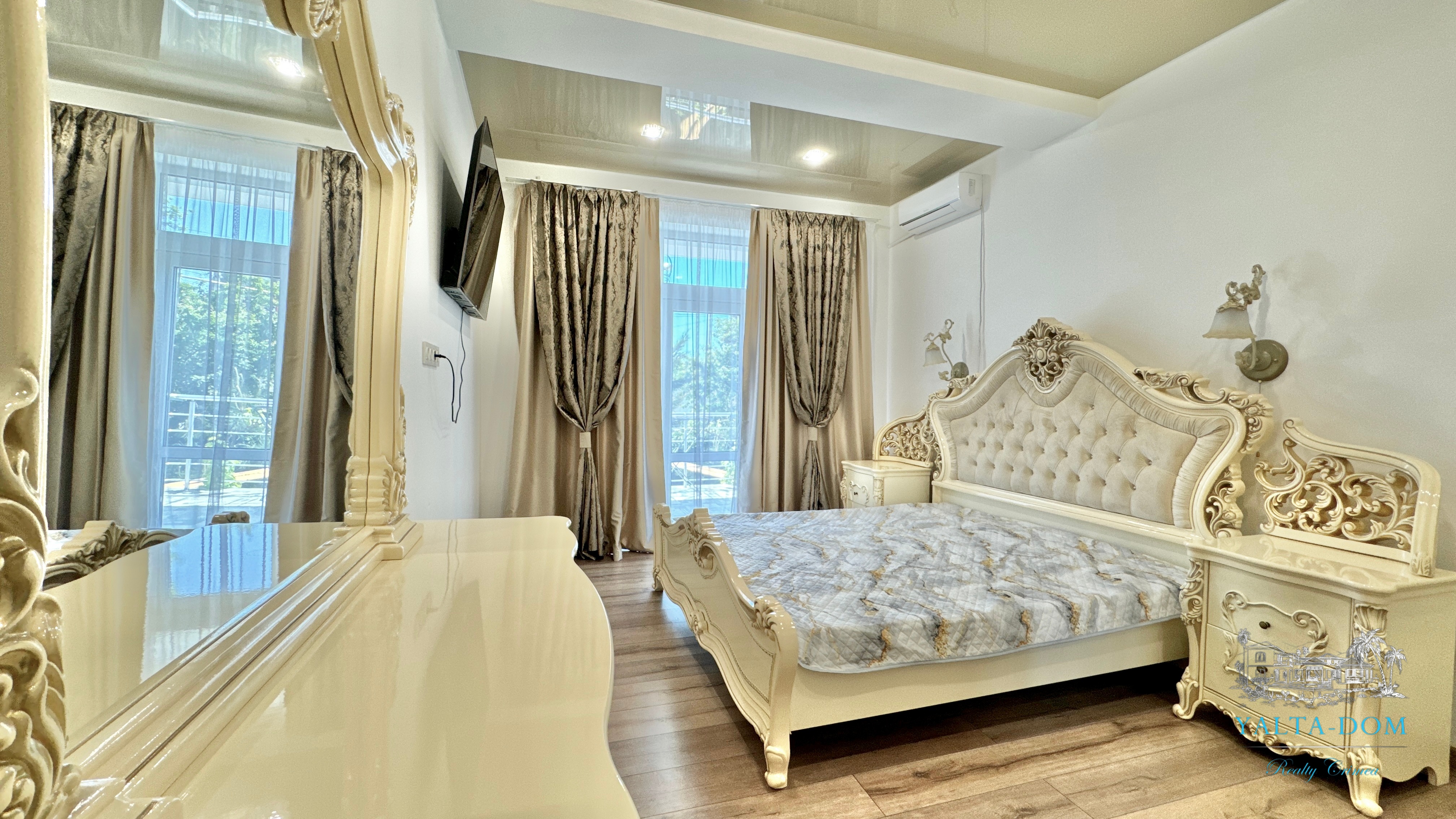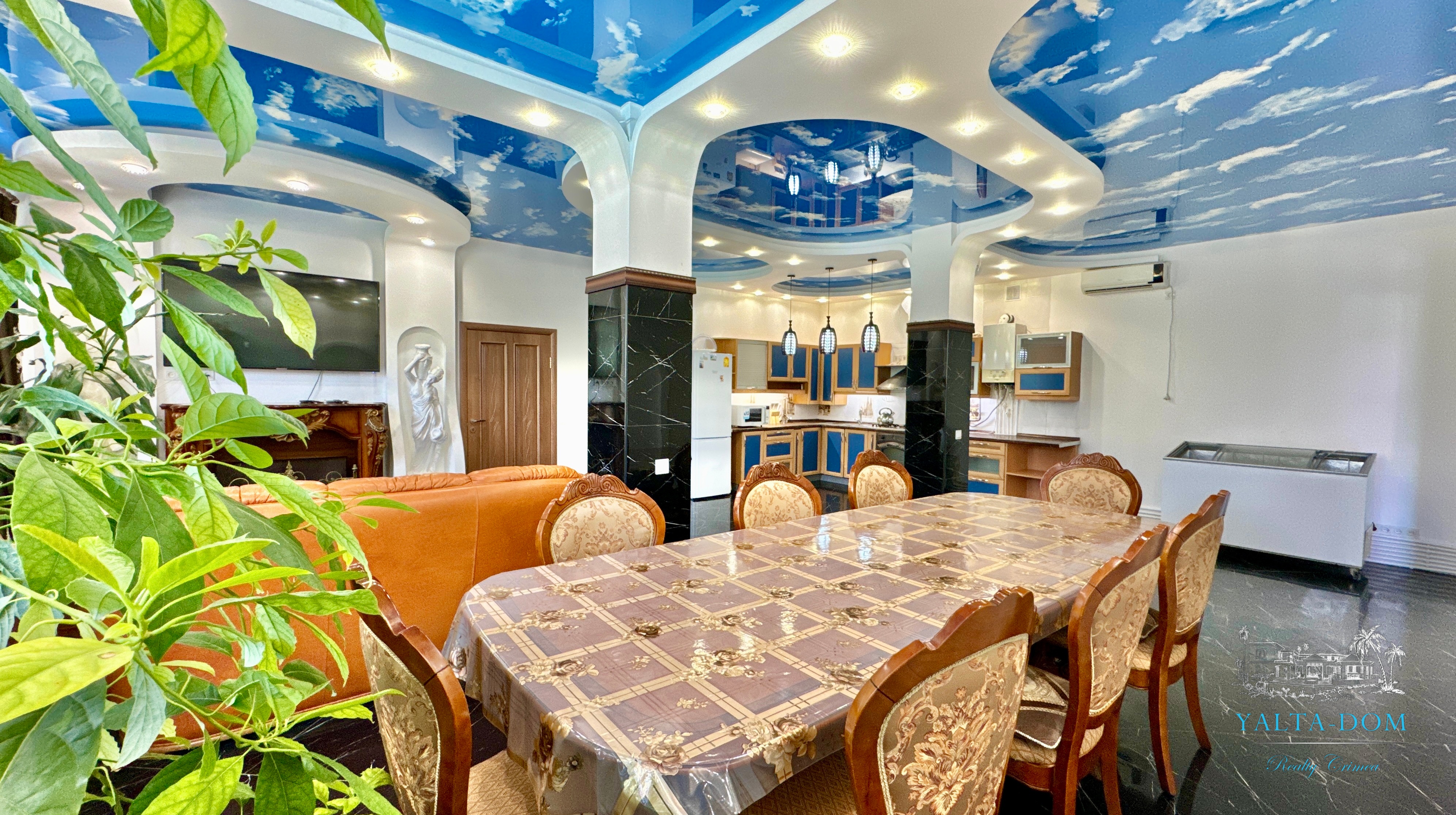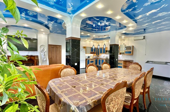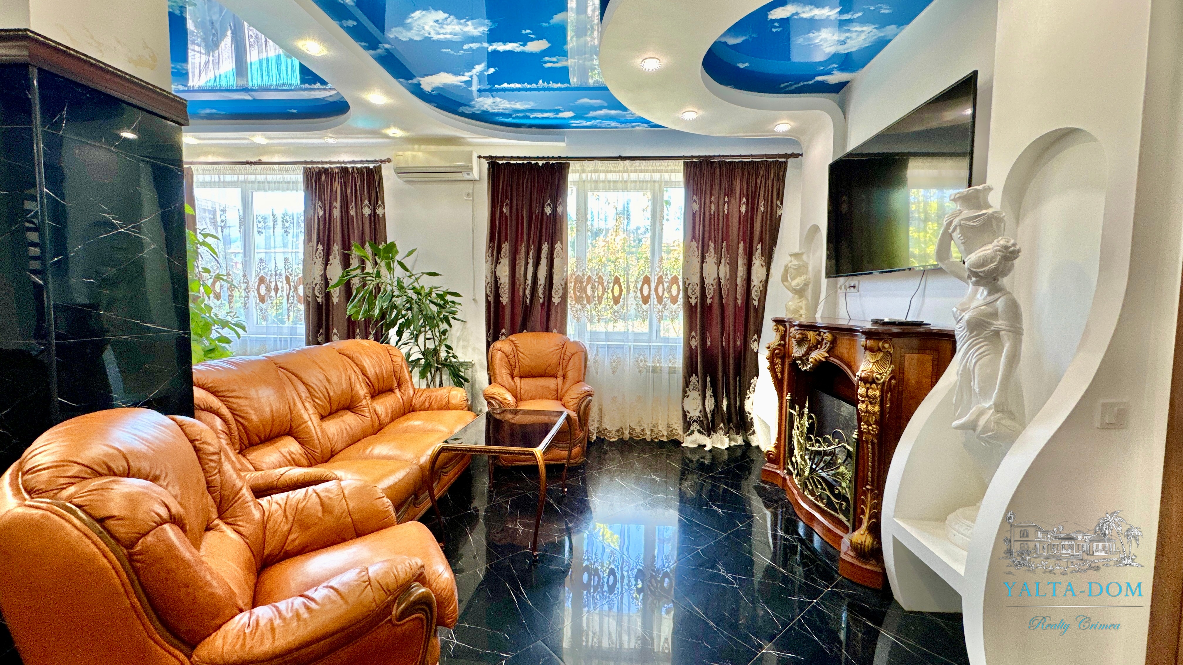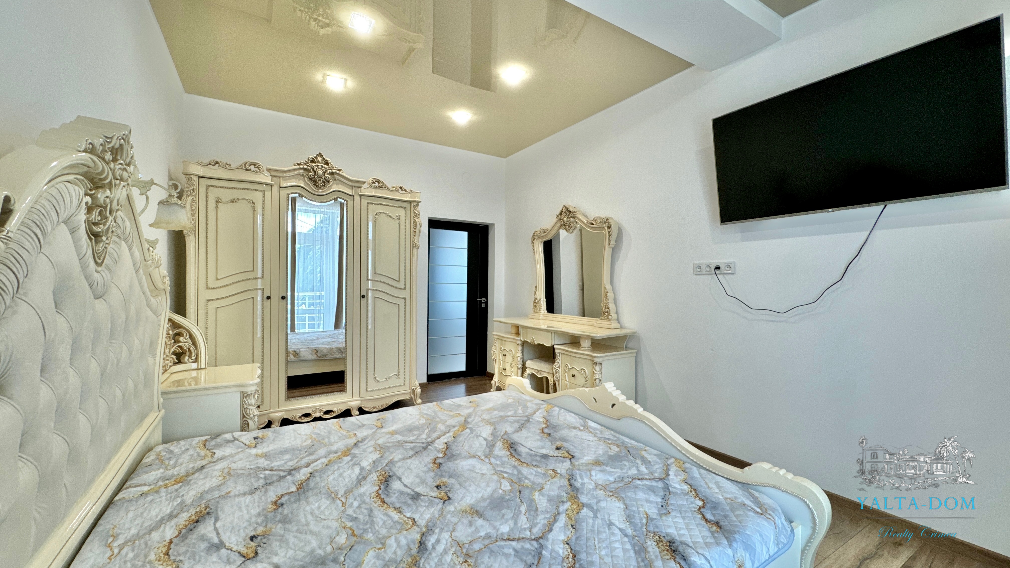 В доме, просторная кухня-гостиная, пять спален с двухспальными кроватями, TV и кондиционеры в каждой комнате; на втором этаже, выход из каждой спальни на открытую террасу с видом на море и горы. На кухне – полный комплект техники и посуды: микроволновая печь, газовая плита, духовка, холодильник.
