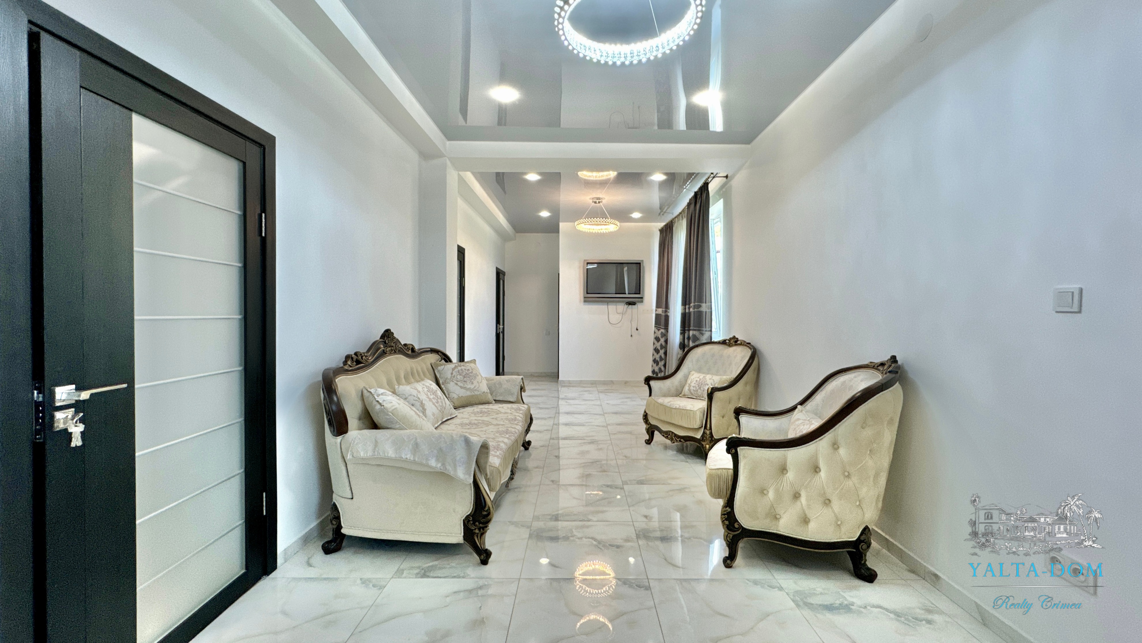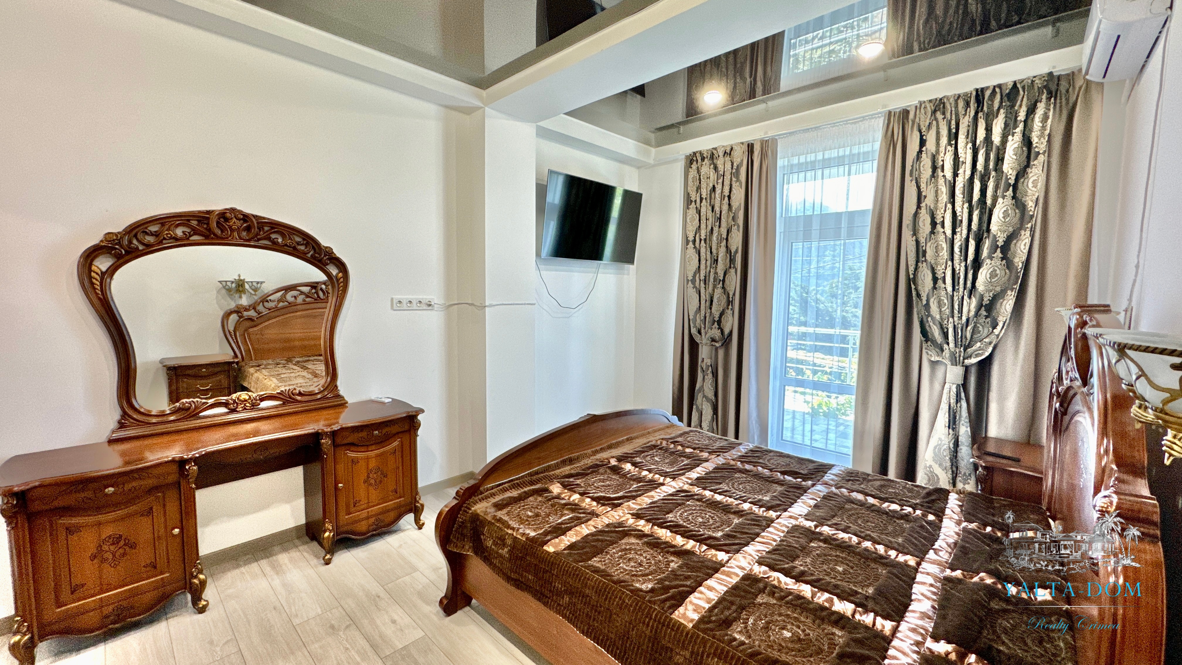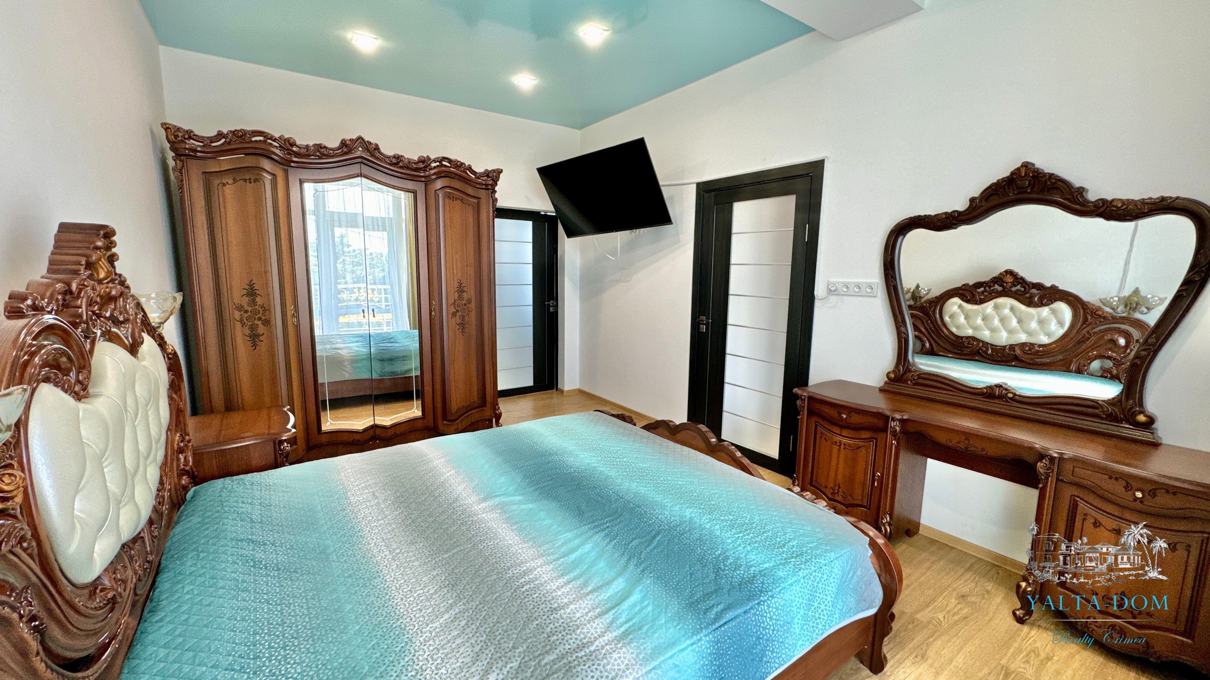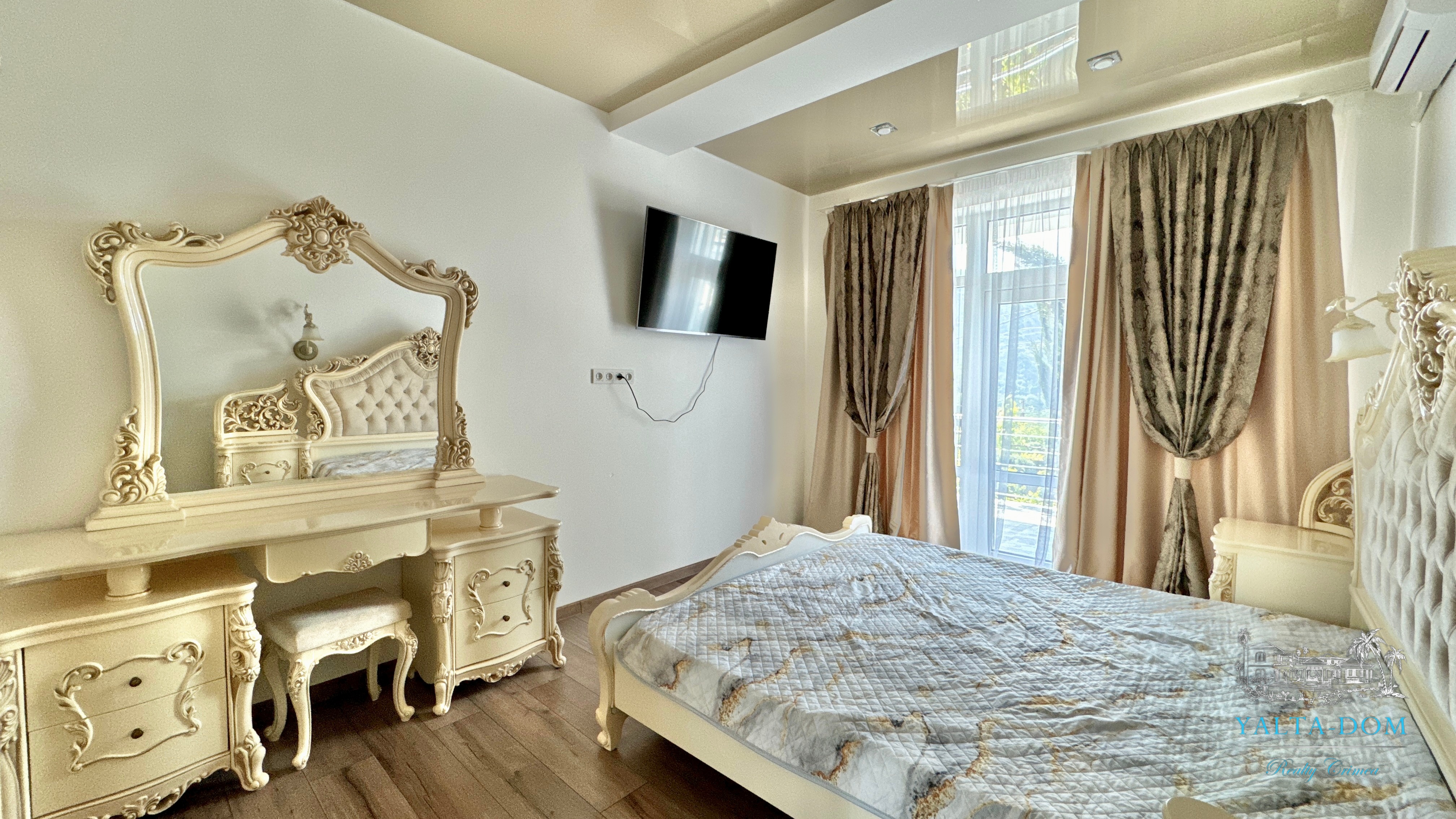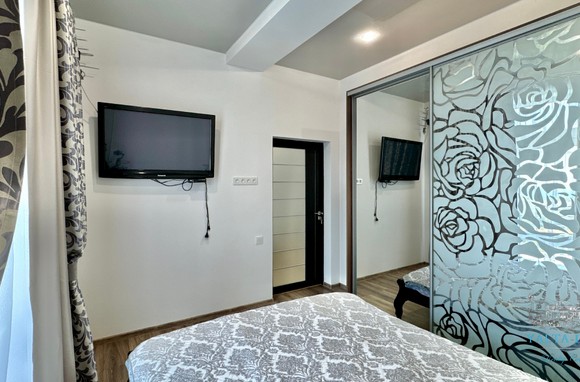 В доме, просторная кухня-гостиная, пять спален с двухспальными кроватями, TV и кондиционеры в каждой комнате; на втором этаже, выход из каждой спальни на открытую террасу с видом на море и горы. На кухне – полный комплект техники и посуды: микроволновая печь, газовая плита, духовка, холодильник.