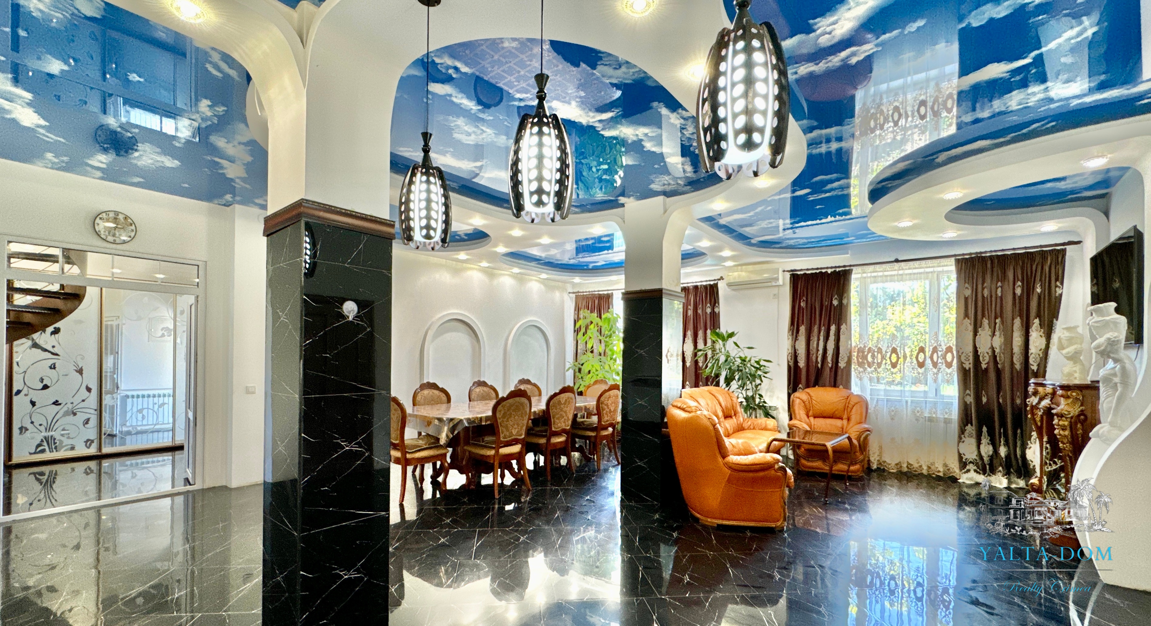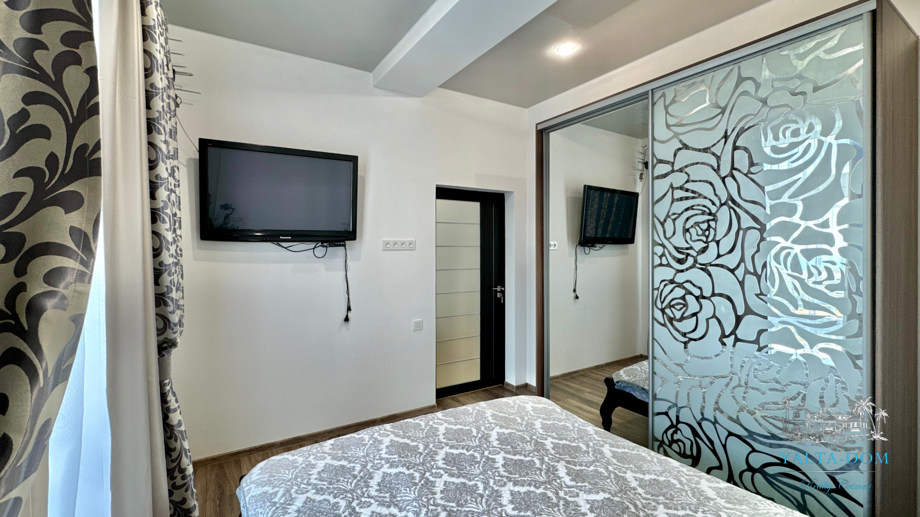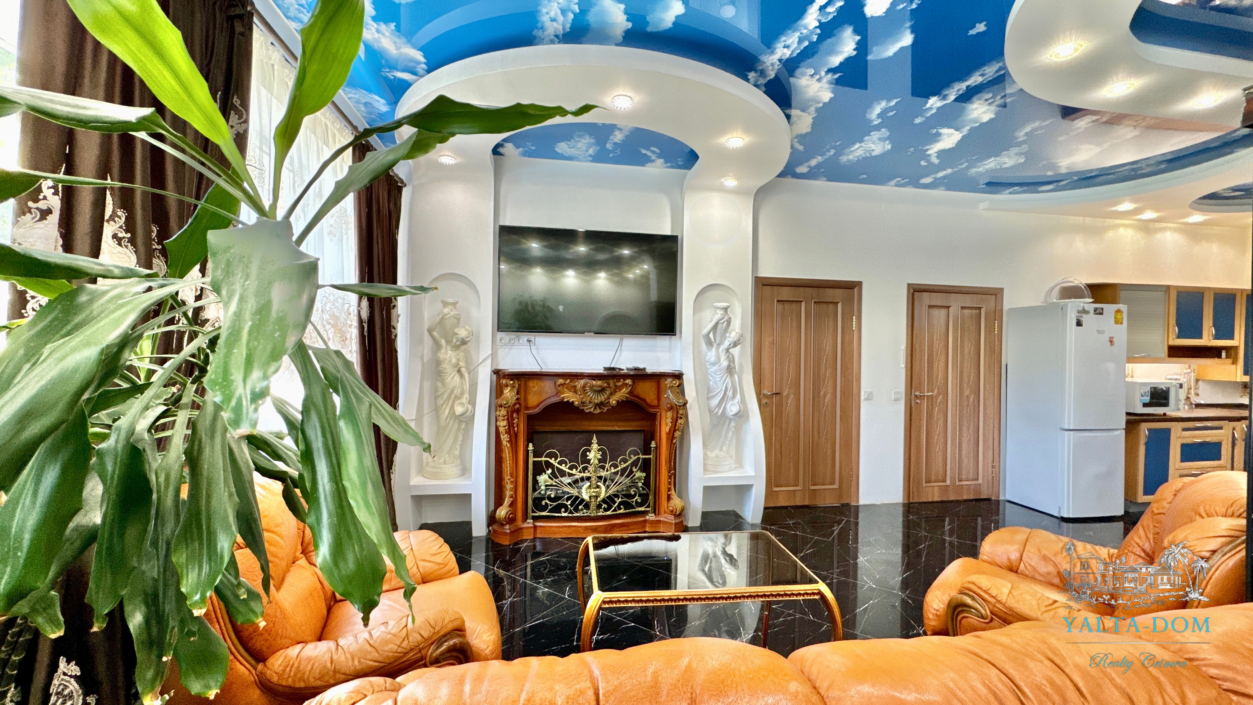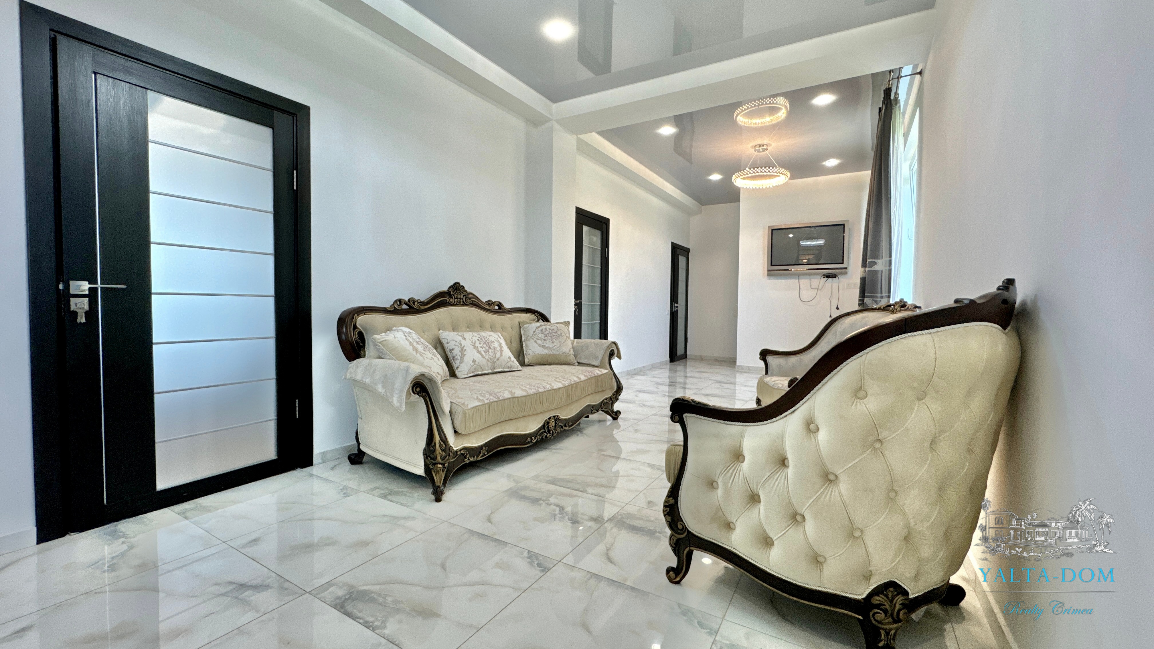 В доме, просторная кухня-гостиная, пять спален с двухспальными кроватями, TV и кондиционеры в каждой комнате; на втором этаже, выход из каждой спальни на открытую террасу с видом на море и горы. На кухне – полный комплект техники и посуды: микроволновая печь, газовая плита, духовка, холодильник.