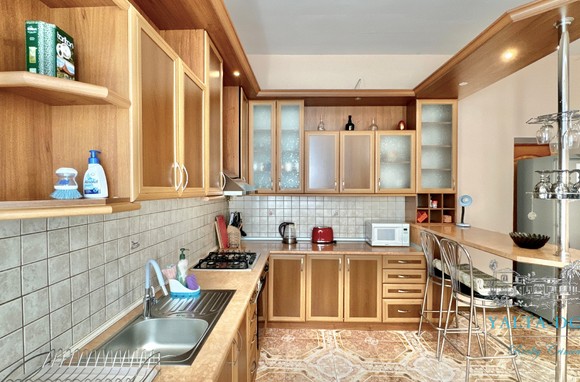 Первый этаж: холл. Столовая. Спальня с двуспальной кроватью, спальня с односпальной кроватью и диваном. Санузел с ванной совмещены. Кухня с обеденной зоной, на кухне имеются все необходимый бытовые приборы включая посудомоечную машину, микроволновую печь, электрический чайник.