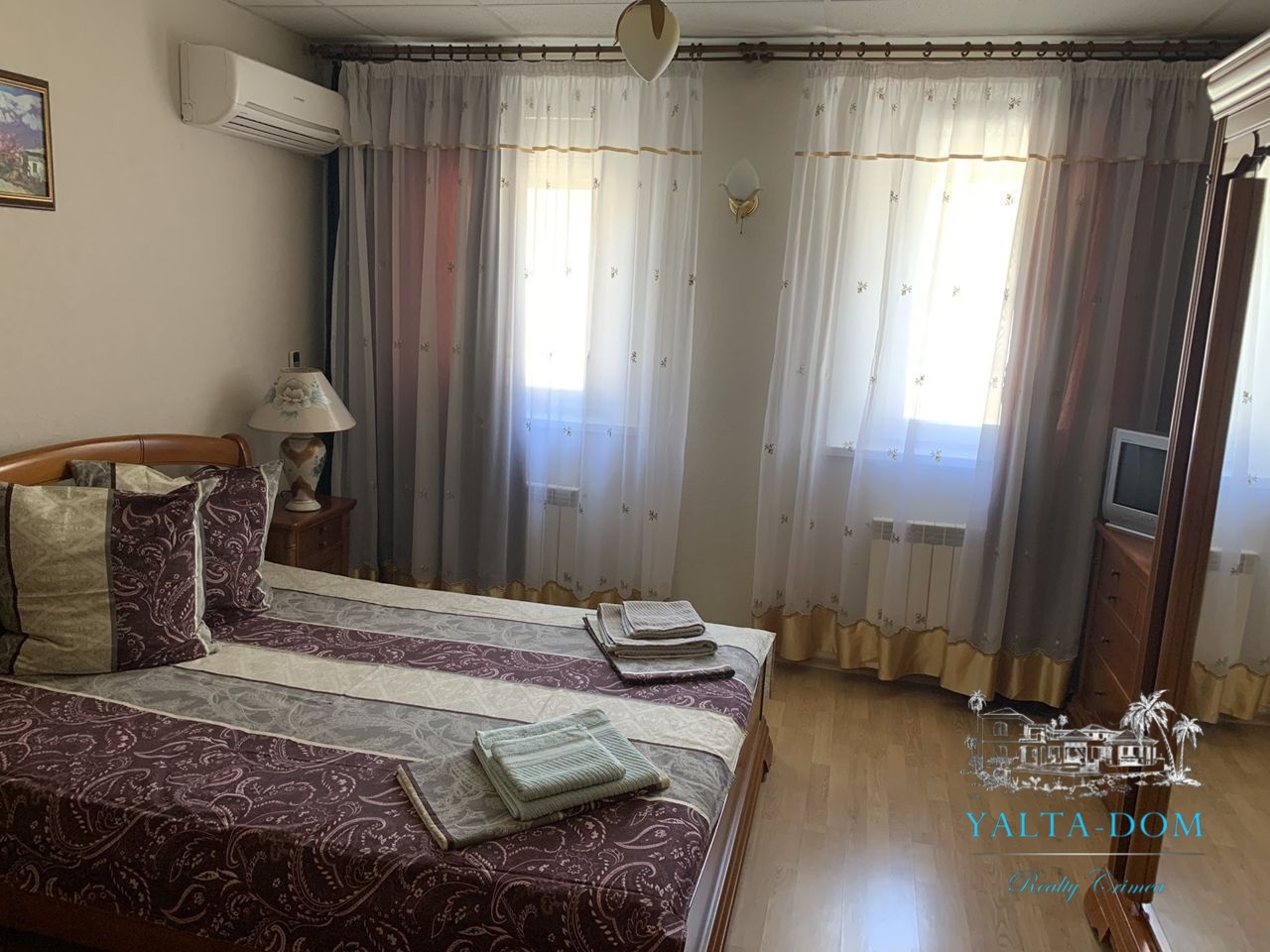 Общая площадь 200 м2. 3 этажа. 5 спален + гостиная + кухня- столовая. 5 санузлов (в каждой комнате).