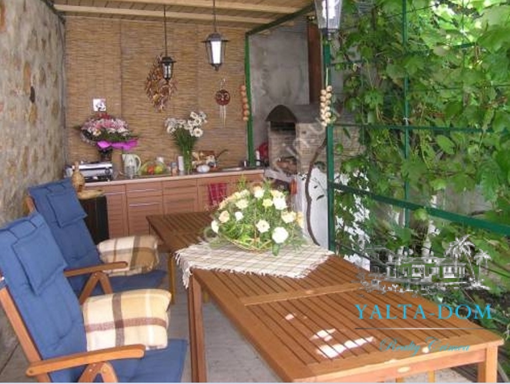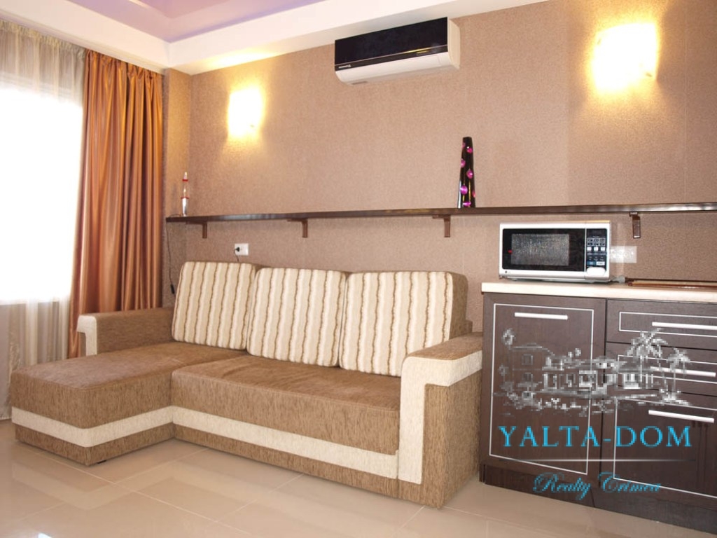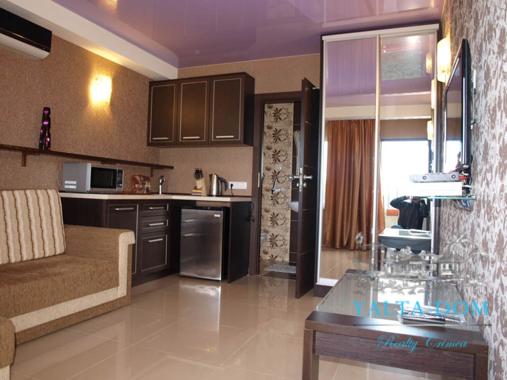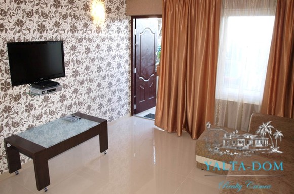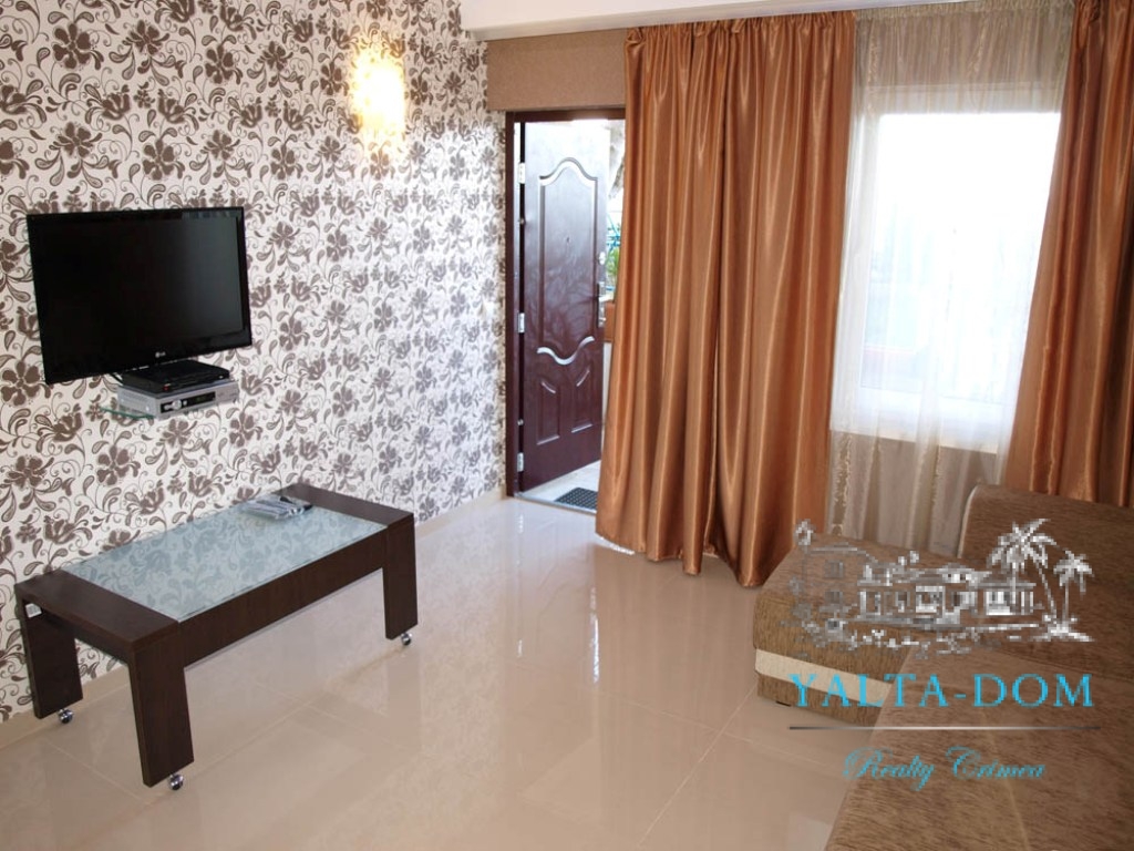 Квартира-студия гостиничного типа на первом этаже. Имеется раскладывающийся диван, имеется вся бытовая техника: кондиционер, холодильник, электрочайник, микроволновая печь, утюг, фен, плазменный телевизор, спутниковое TV, Wi-Fi. Холодная и горячая вода круглосуточно. Отопление – теплые полы. На территории имеется уютная беседка с летней кухней и газовой плитой, зеленая площадка, качели, гамак, место под барбекю. Рядом с коттеджем – площадка для стоянки автомобилей. Каждый номер располагает балконом с видом на море. Номера выдержаны в стиле Hi-Tech. Имеется прачечная.