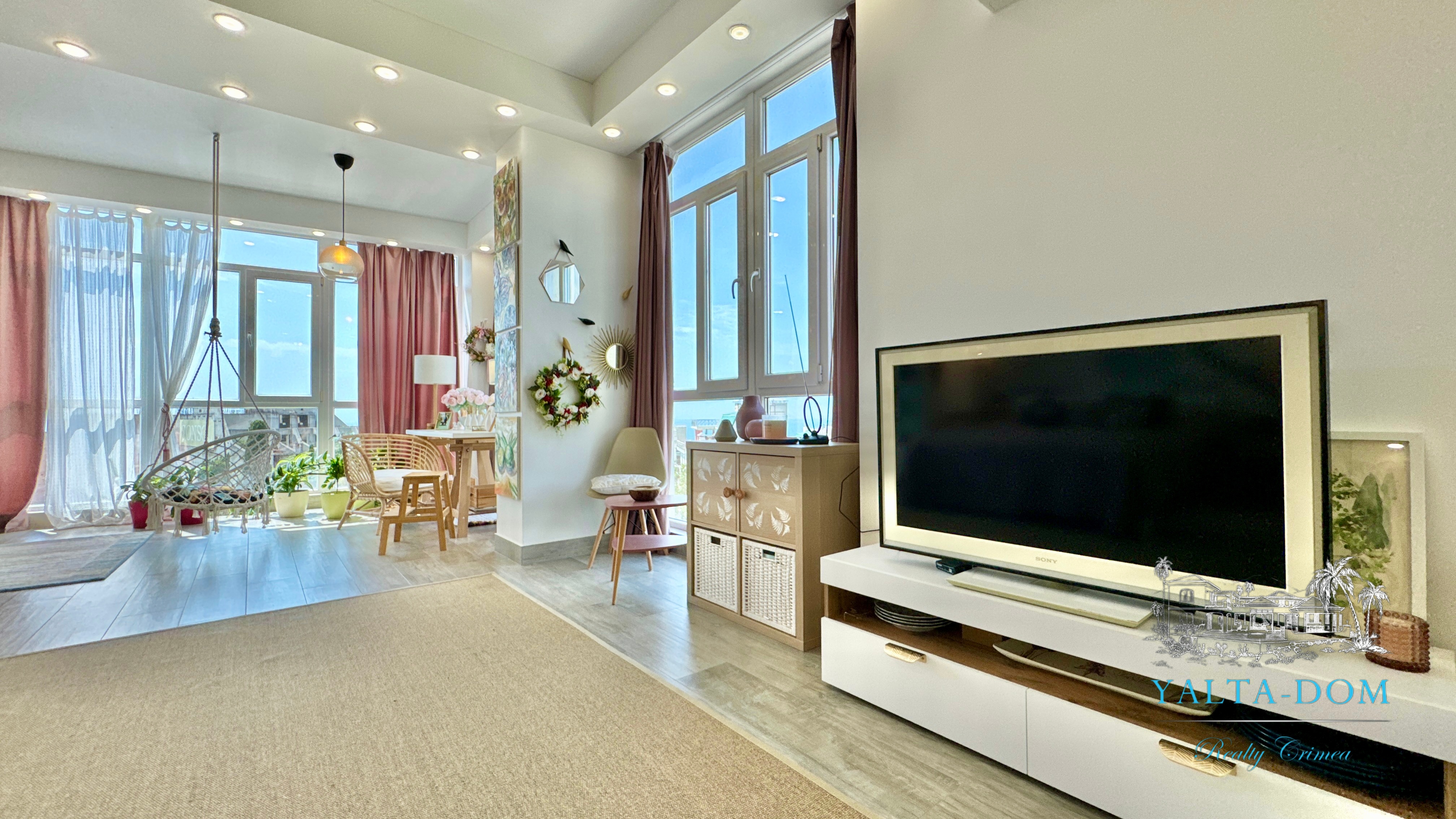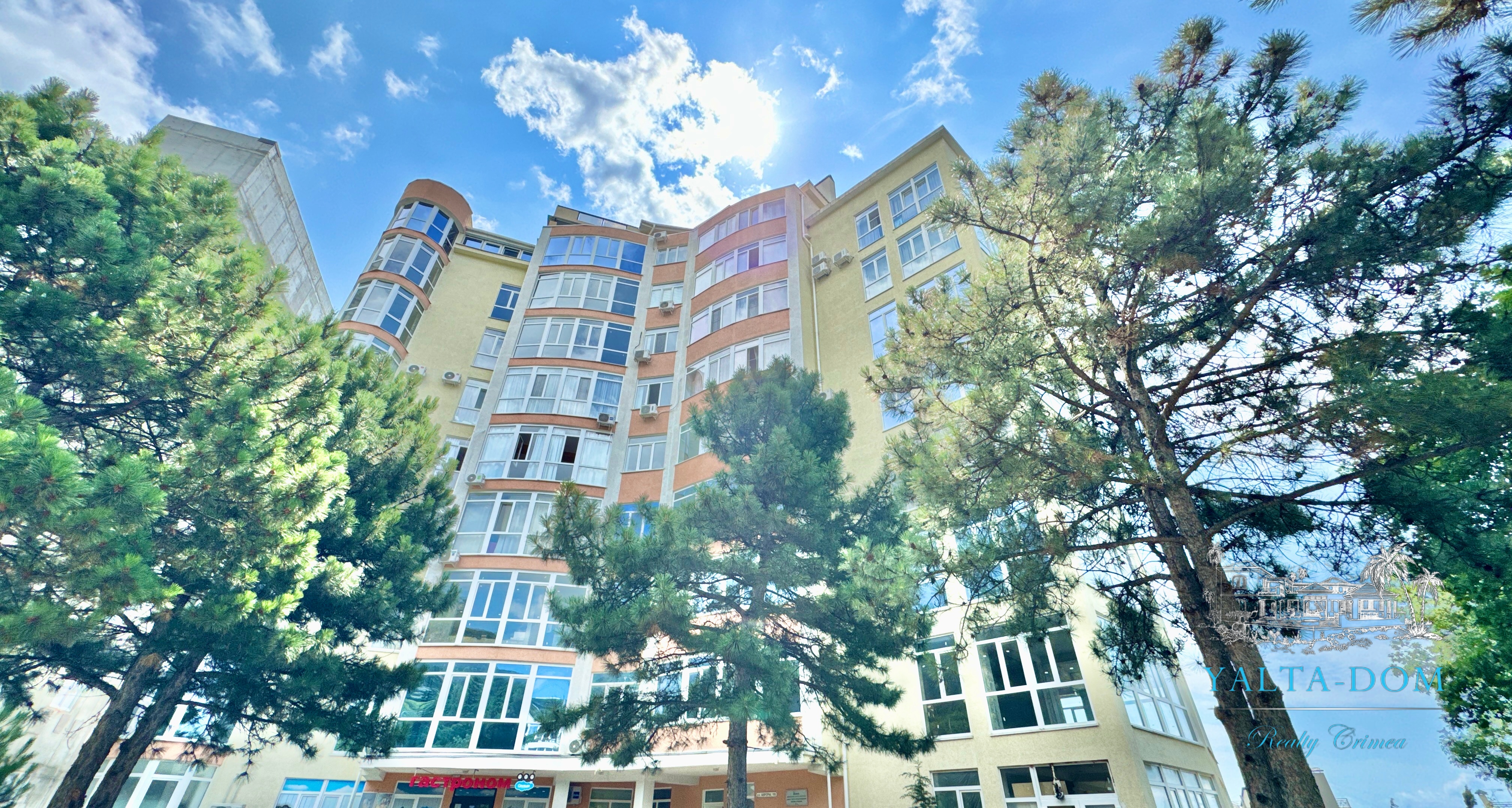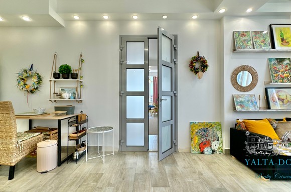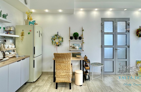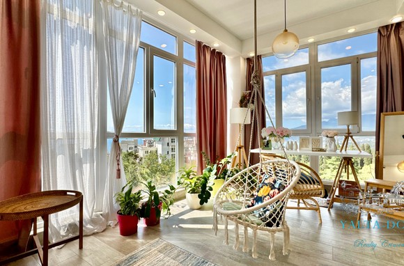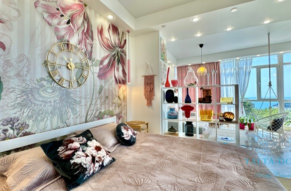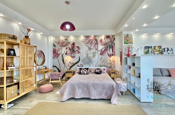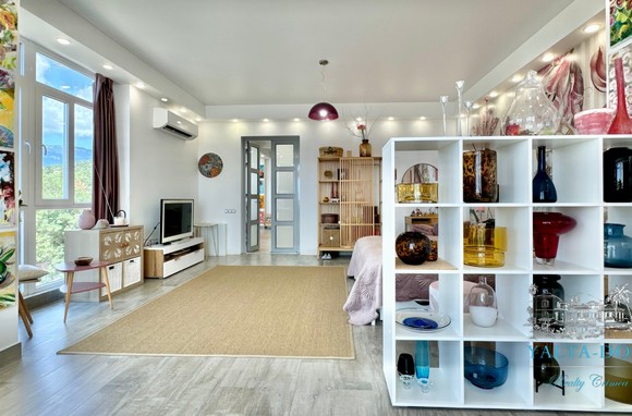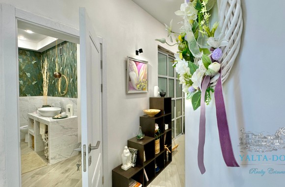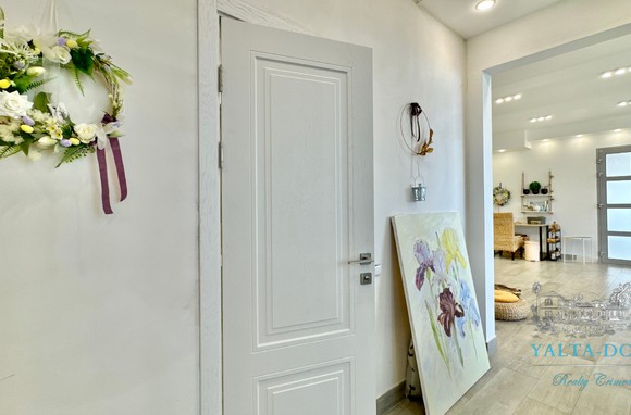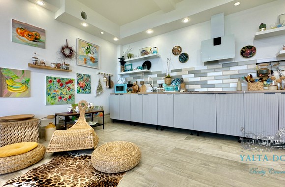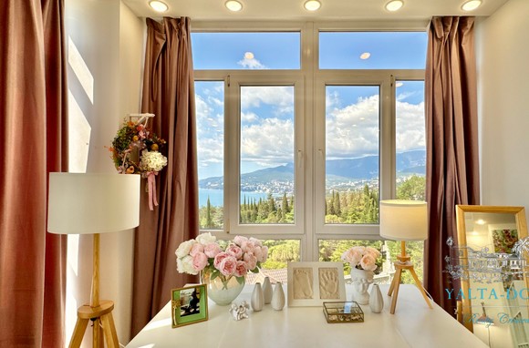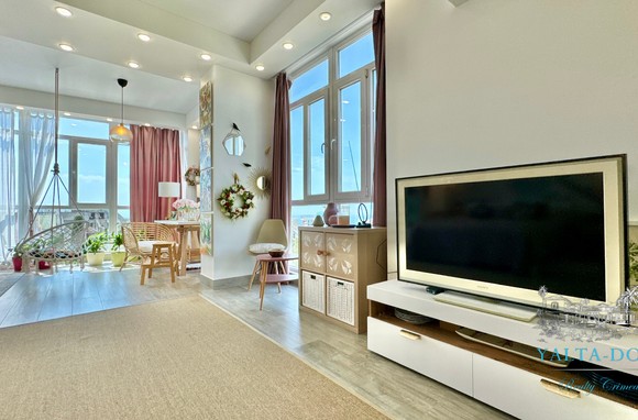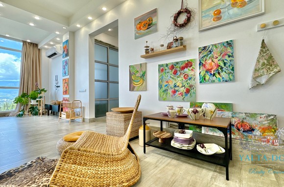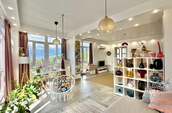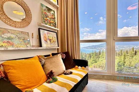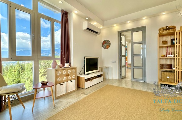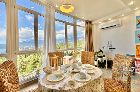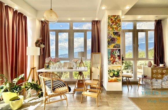 Квартира с прекрасным видом на море и горы, общей площадью 130 квадратных метров, расположена на третьем этаже нового жилищного комплекса в пригороде Ялты, пгт. Восход. Выполнен дизайнерский ремонт, панорамное остекление, есть вся необходимая бытовая техника, мебель и посуда, кондиционеры, индивидуальное отопление. Квартира состоит из зоны прихожей с большим гардеробным шкафом, кухни-гостиной, двух санузлов, большого пространства, разделенного на спальню и зону отдыха. На первом этаже дома расположен продуктовый магазин. Недалеко от дома несколько мелкогалечных пляжей: Отрадное, Никита, гостиницы Ялта-Интурист.