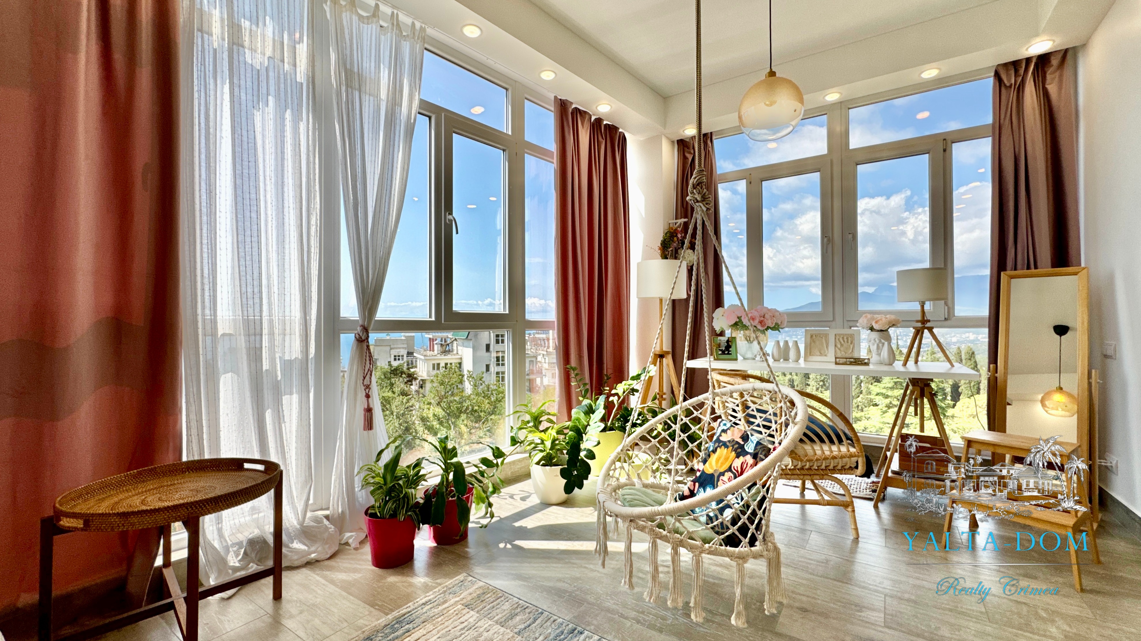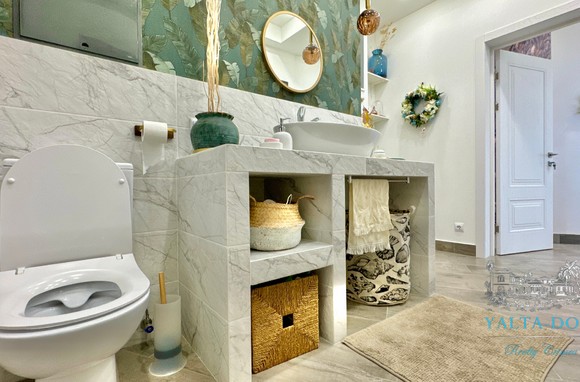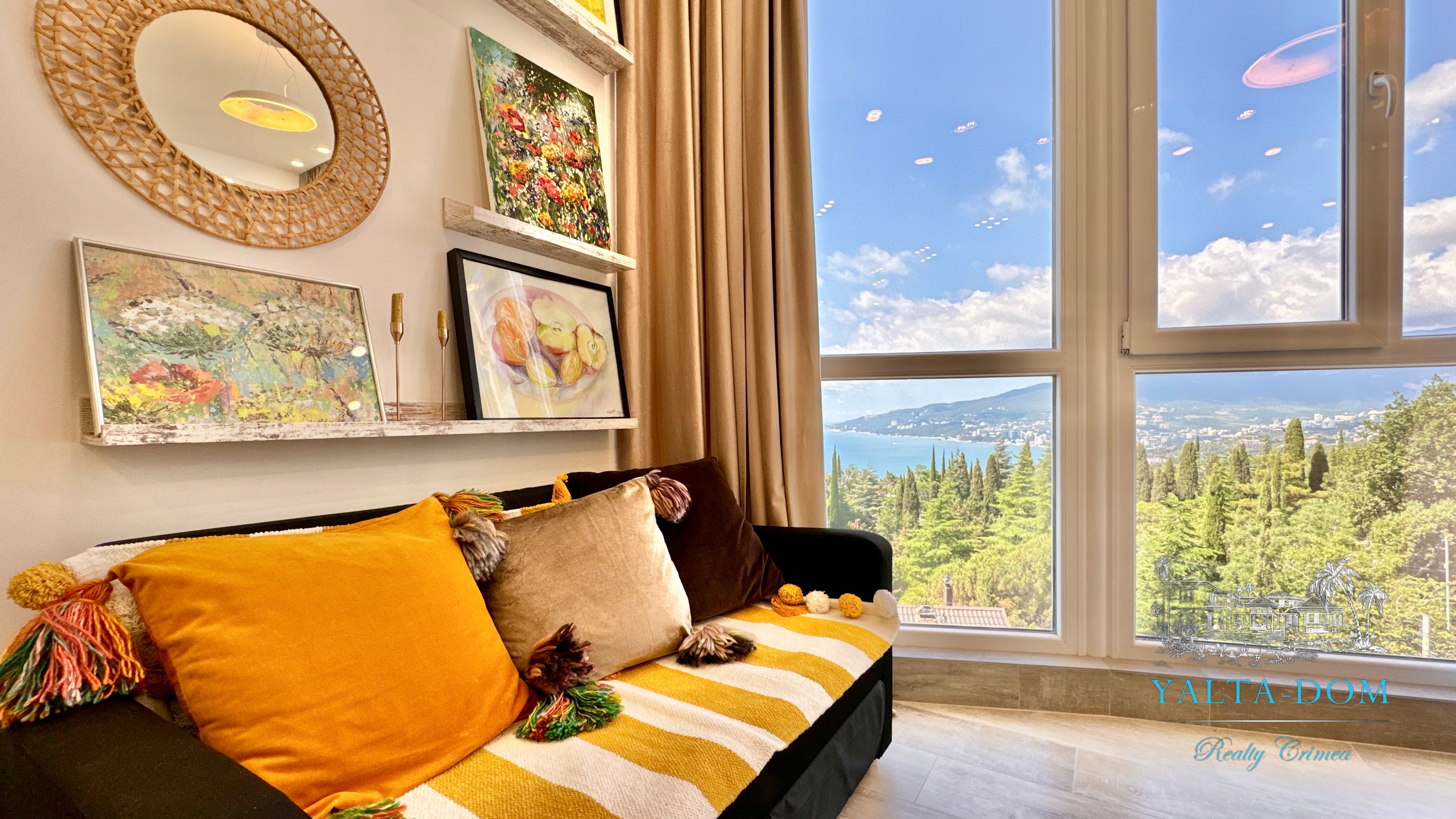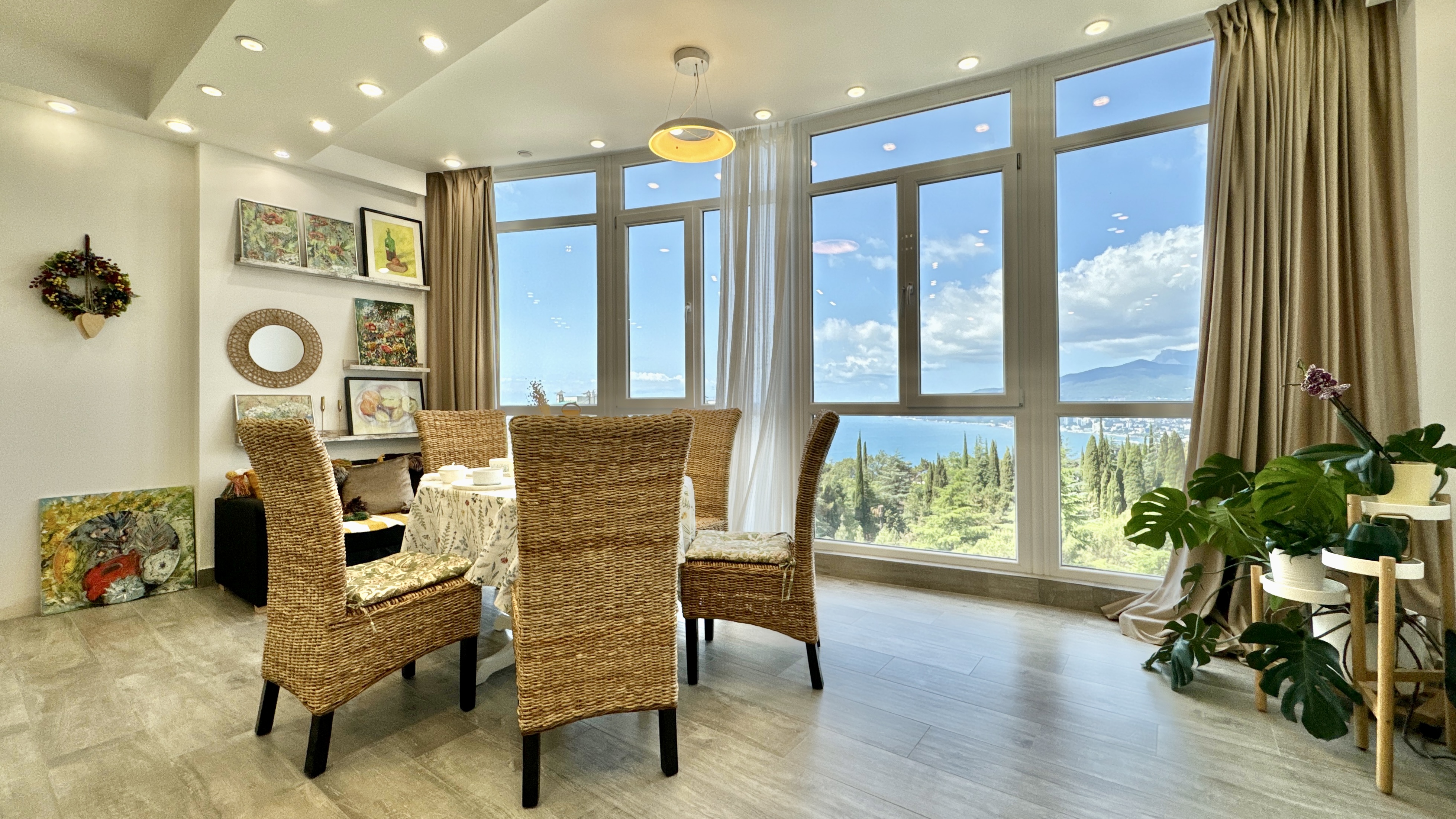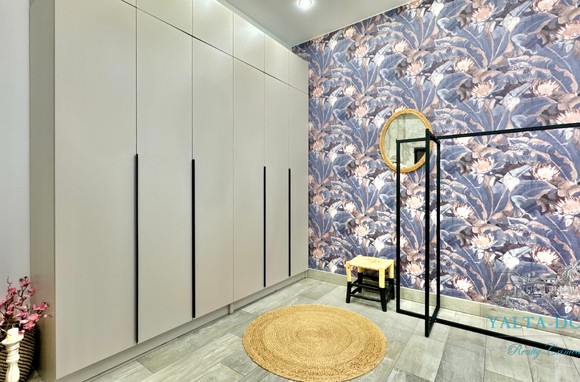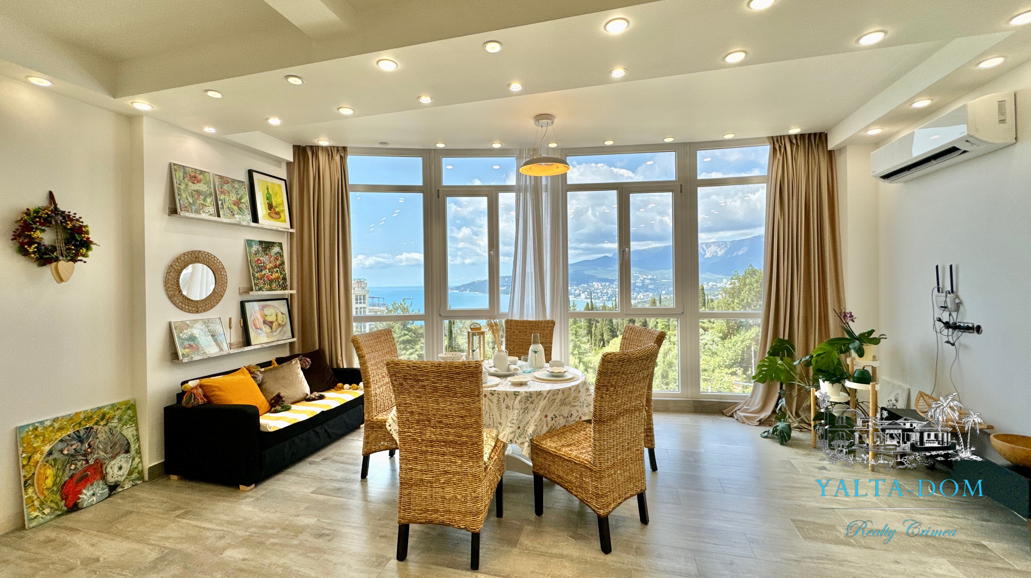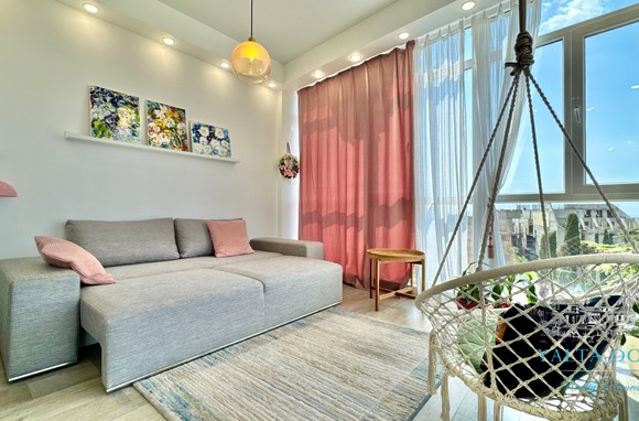 Квартира с прекрасным видом на море и горы, общей площадью 130 квадратных метров, расположена на третьем этаже нового жилищного комплекса в пригороде Ялты, пгт. Восход. Выполнен дизайнерский ремонт, панорамное остекление, есть вся необходимая бытовая техника, мебель и посуда, кондиционеры, индивидуальное отопление. Квартира состоит из зоны прихожей с большим гардеробным шкафом, кухни-гостиной, двух санузлов, большого пространства, разделенного на спальню и зону отдыха. На первом этаже дома расположен продуктовый магазин. Недалеко от дома несколько мелкогалечных пляжей: Отрадное, Никита, гостиницы Ялта-Интурист.