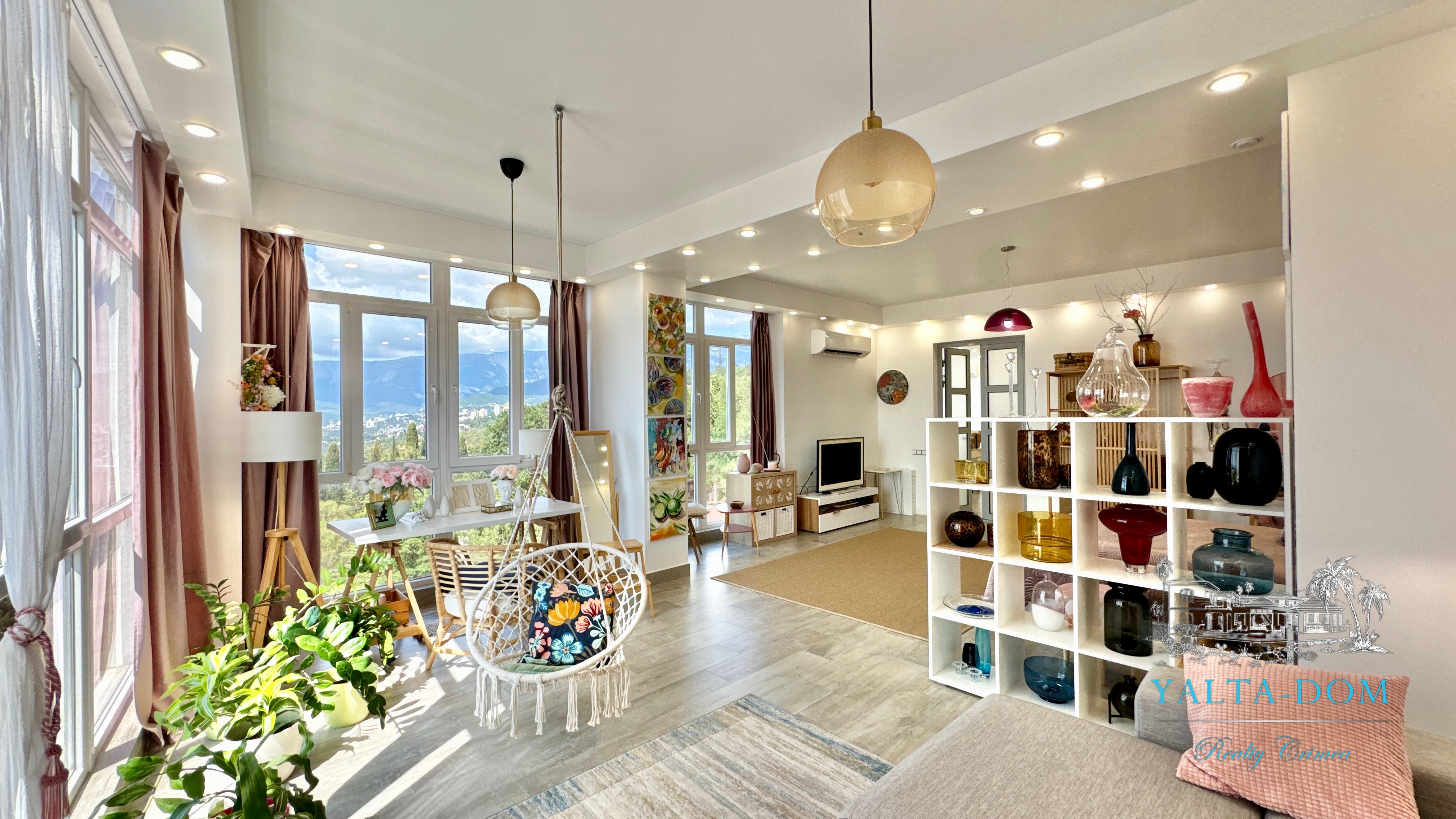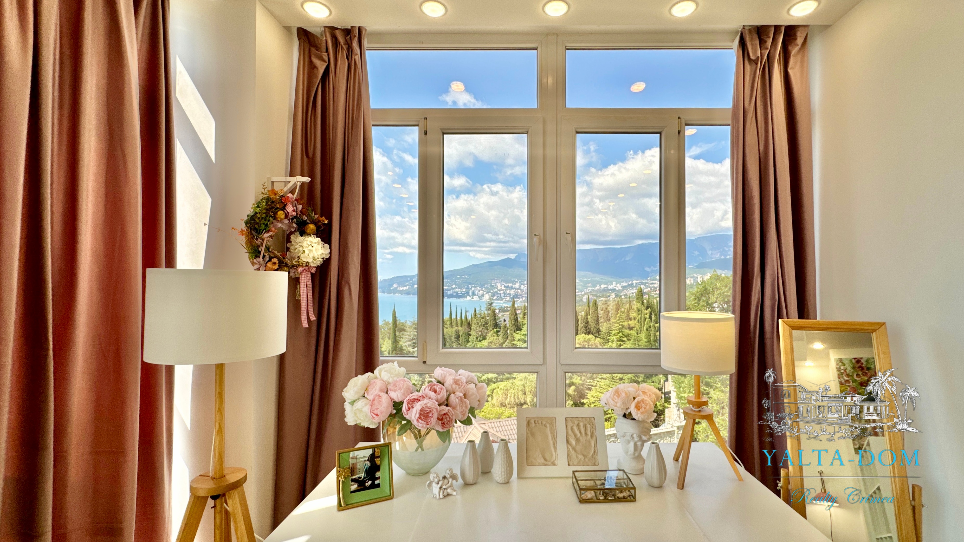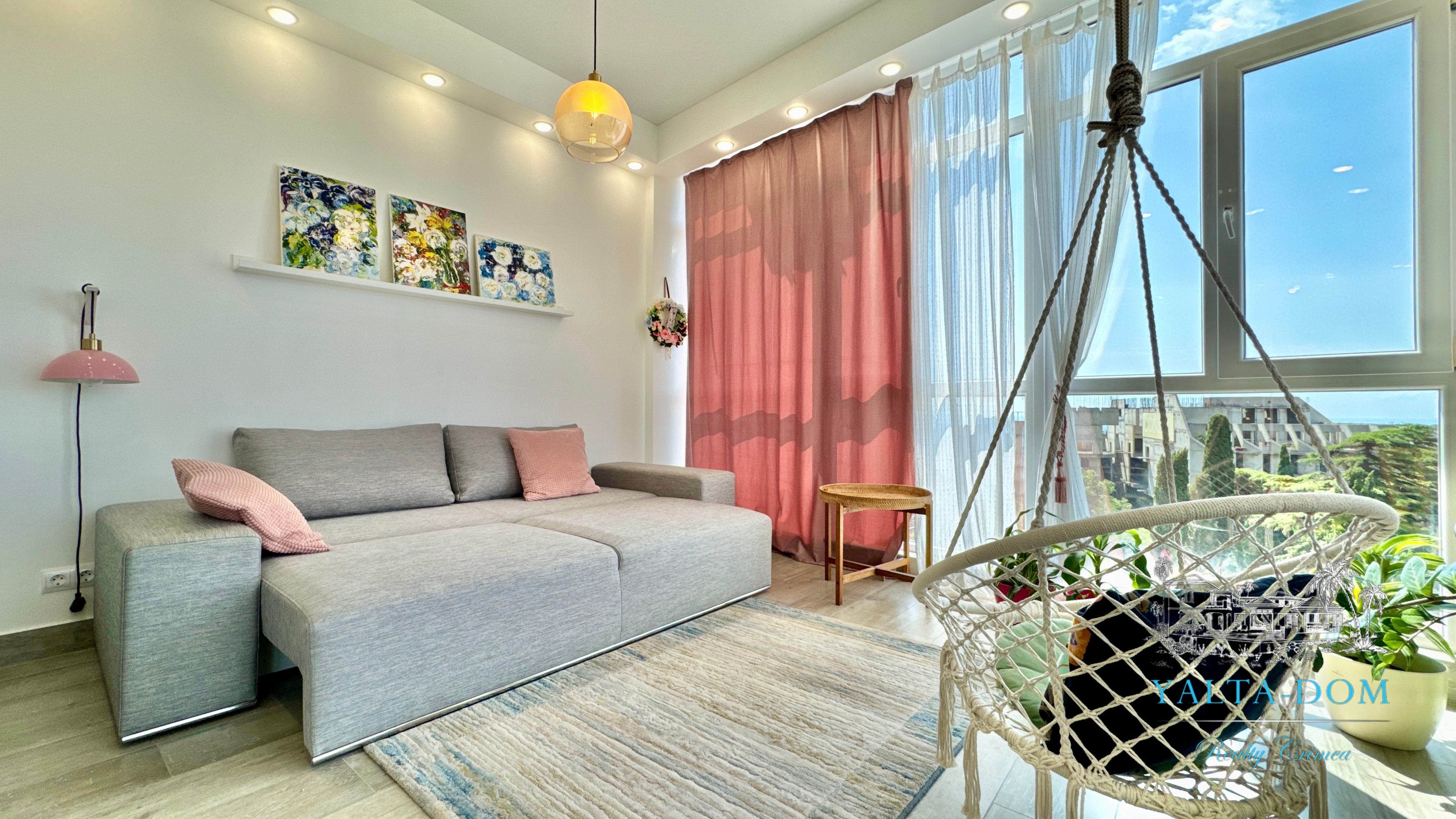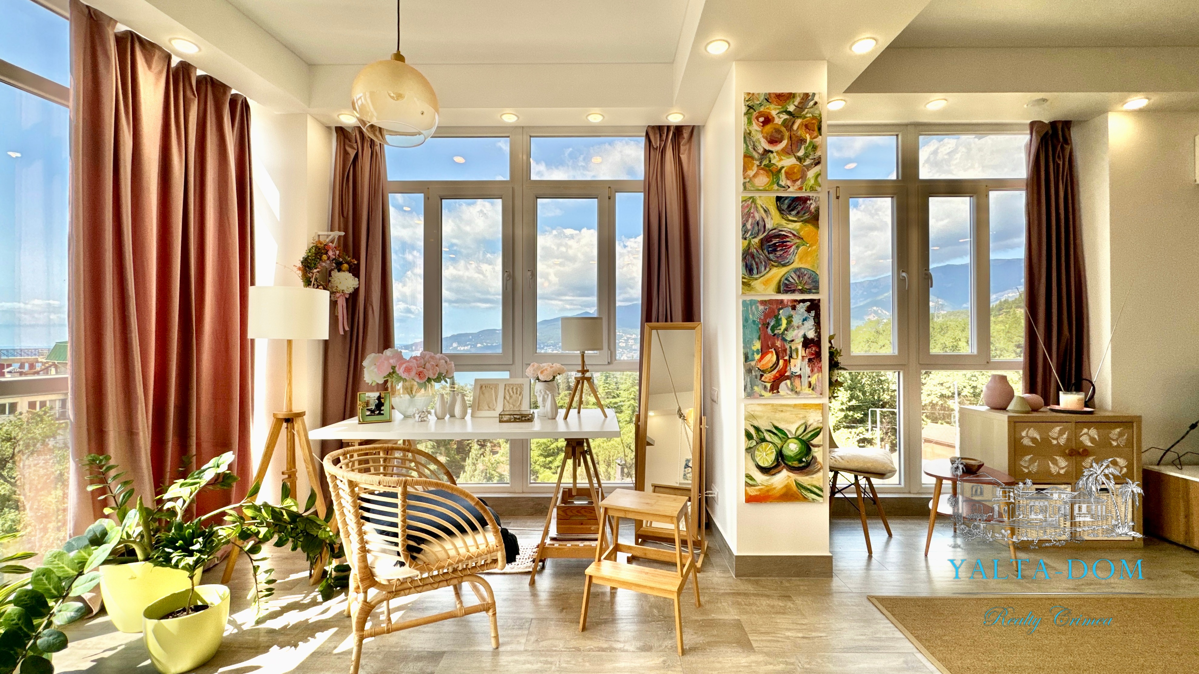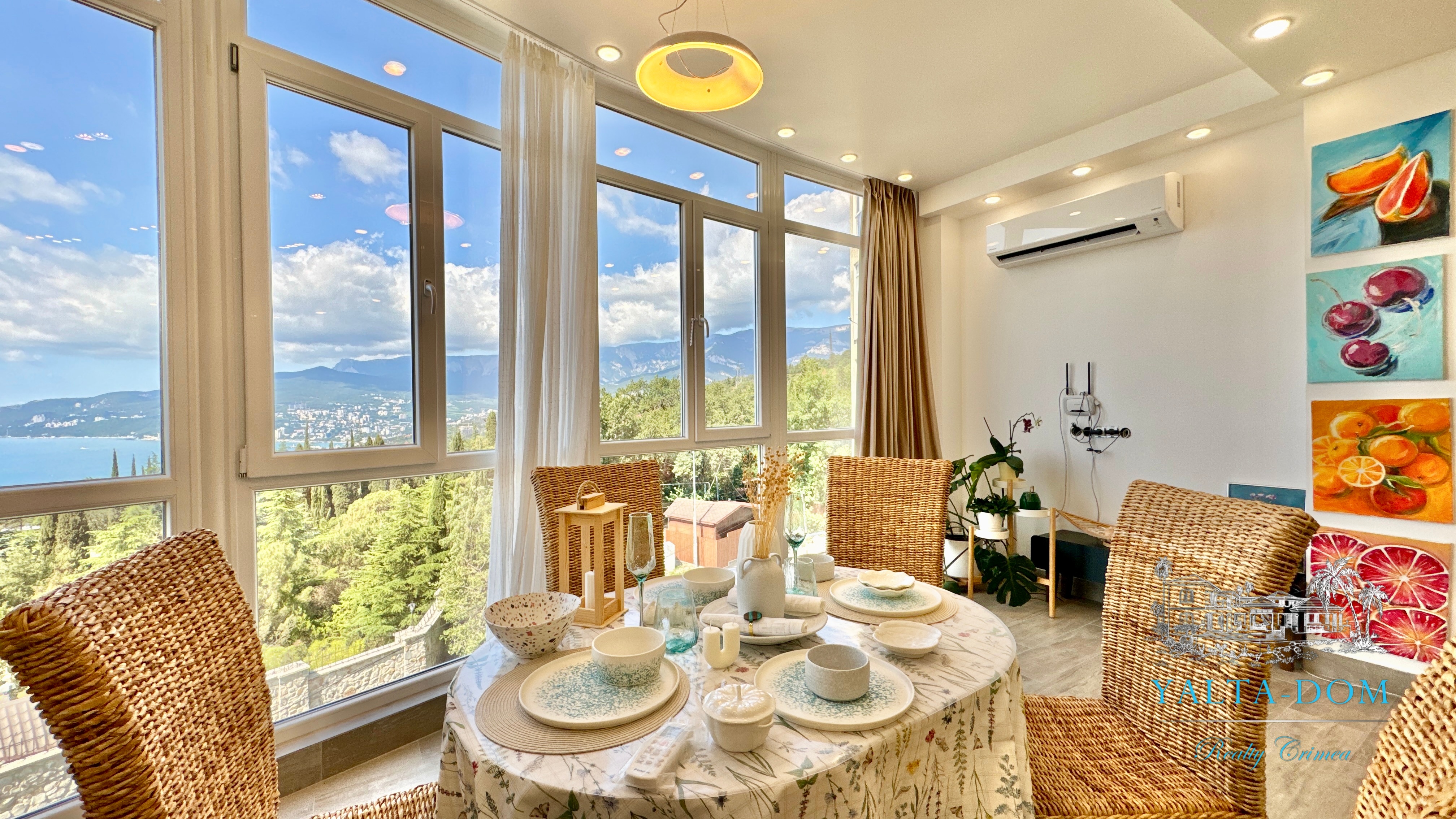 Квартира с прекрасным видом на море и горы, общей площадью 130 квадратных метров, расположена на третьем этаже нового жилищного комплекса в пригороде Ялты, пгт. Восход. Выполнен дизайнерский ремонт, панорамное остекление, есть вся необходимая бытовая техника, мебель и посуда, кондиционеры, индивидуальное отопление. Квартира состоит из зоны прихожей с большим гардеробным шкафом, кухни-гостиной, двух санузлов, большого пространства, разделенного на спальню и зону отдыха. На первом этаже дома расположен продуктовый магазин. Недалеко от дома несколько мелкогалечных пляжей: Отрадное, Никита, гостиницы Ялта-Интурист.