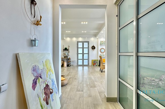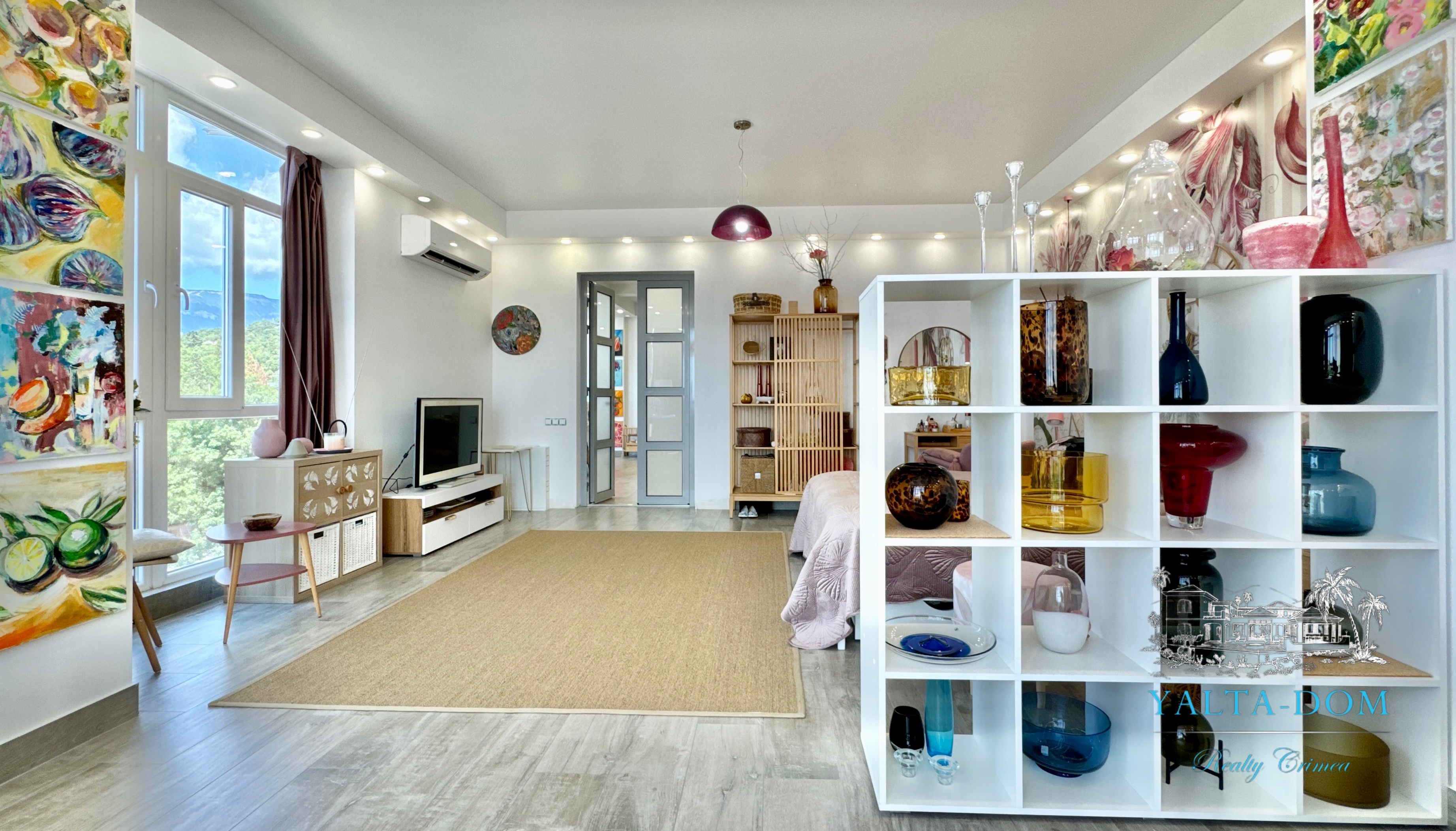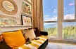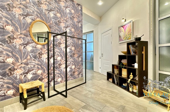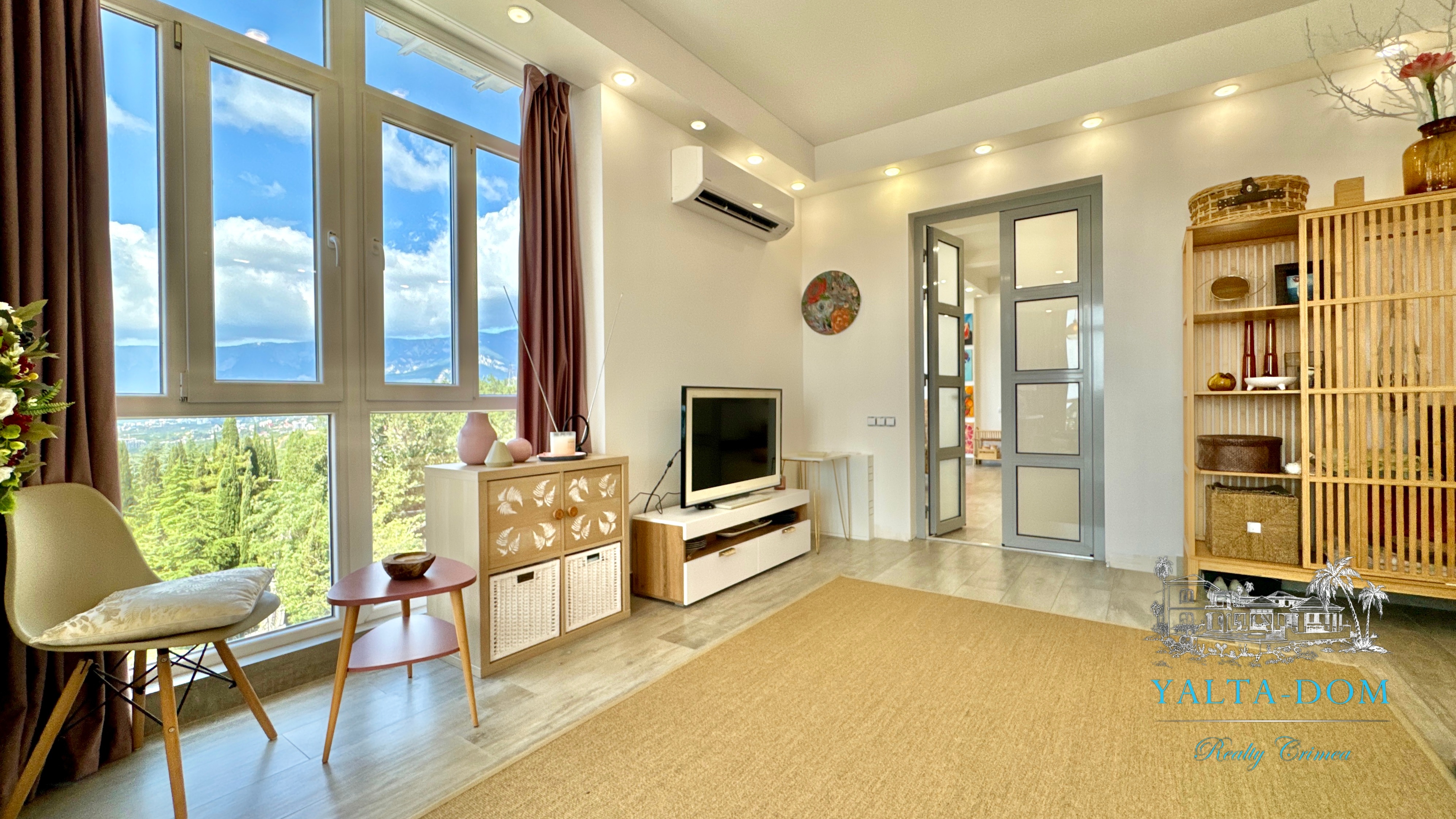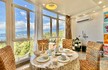 Прихожая с вместительным шкафом, зеркалом, санузел с ванной и стиральной машинкой, санузел гостевой, просторная кухня-гостиная со всем необходимым, вход в спальню, столик для макияжа,TV, кондиционер, двухспальная кровать; зона отдыха с раскладным диваном, кондиционером, панорамным остеклением с видом на море и горы.