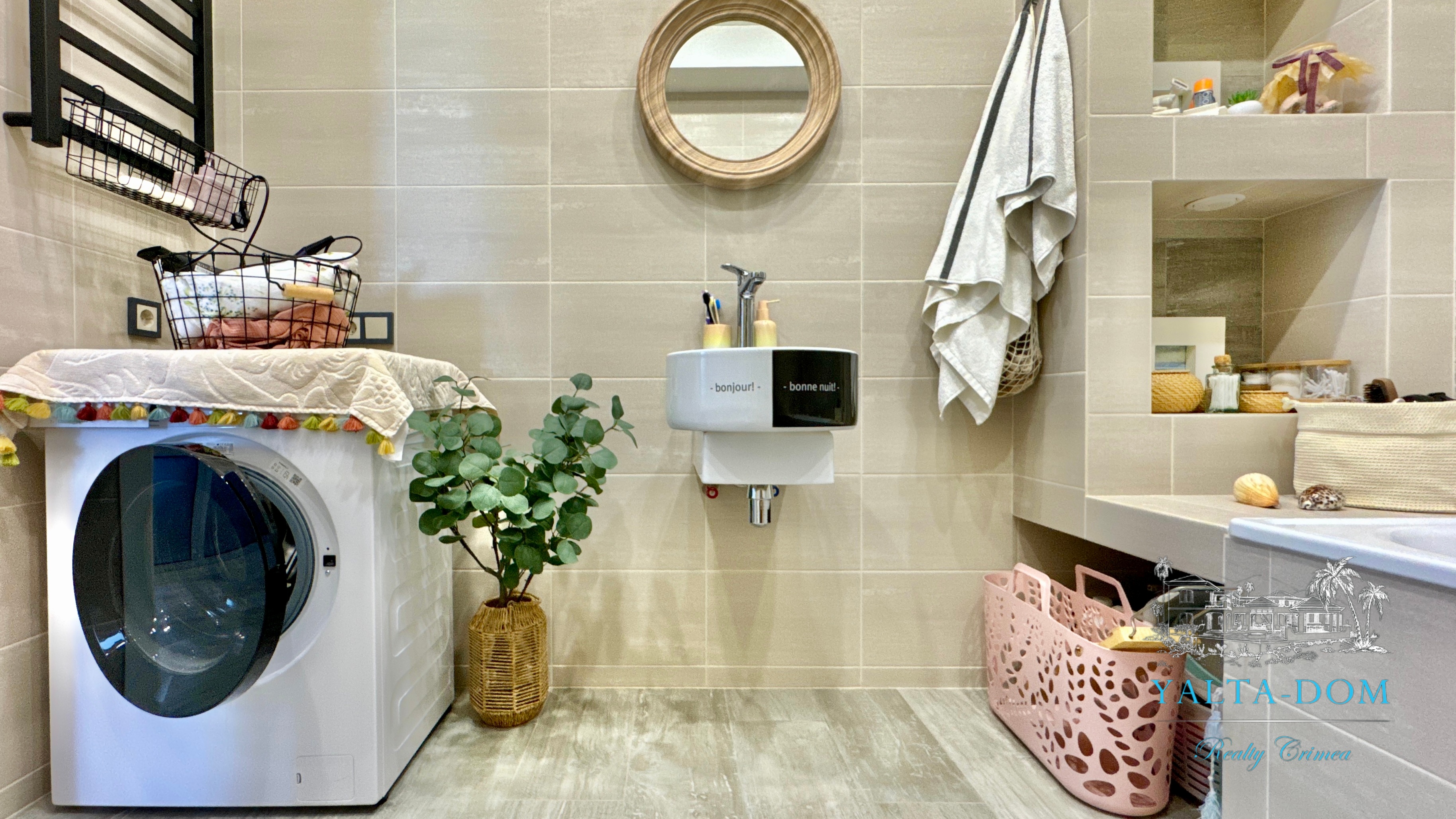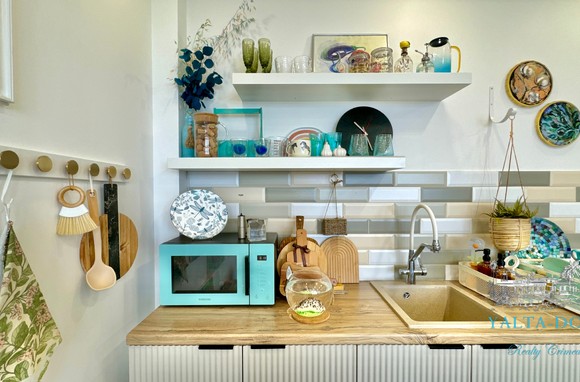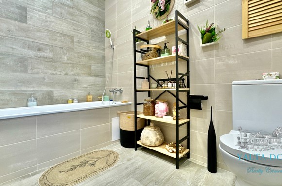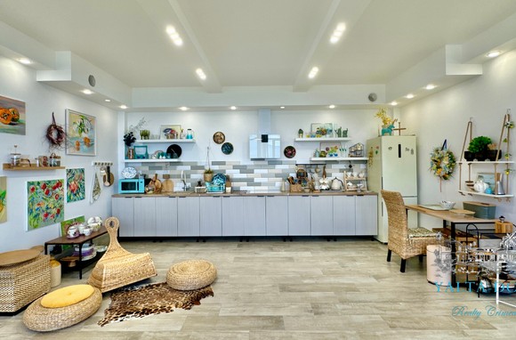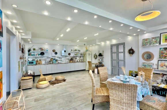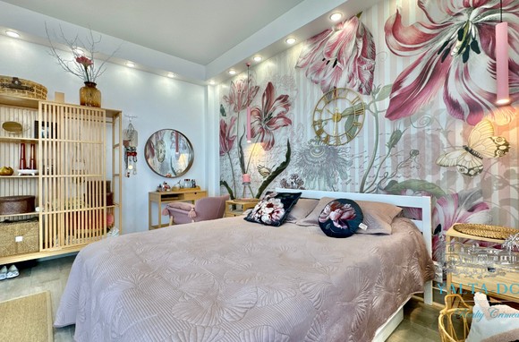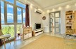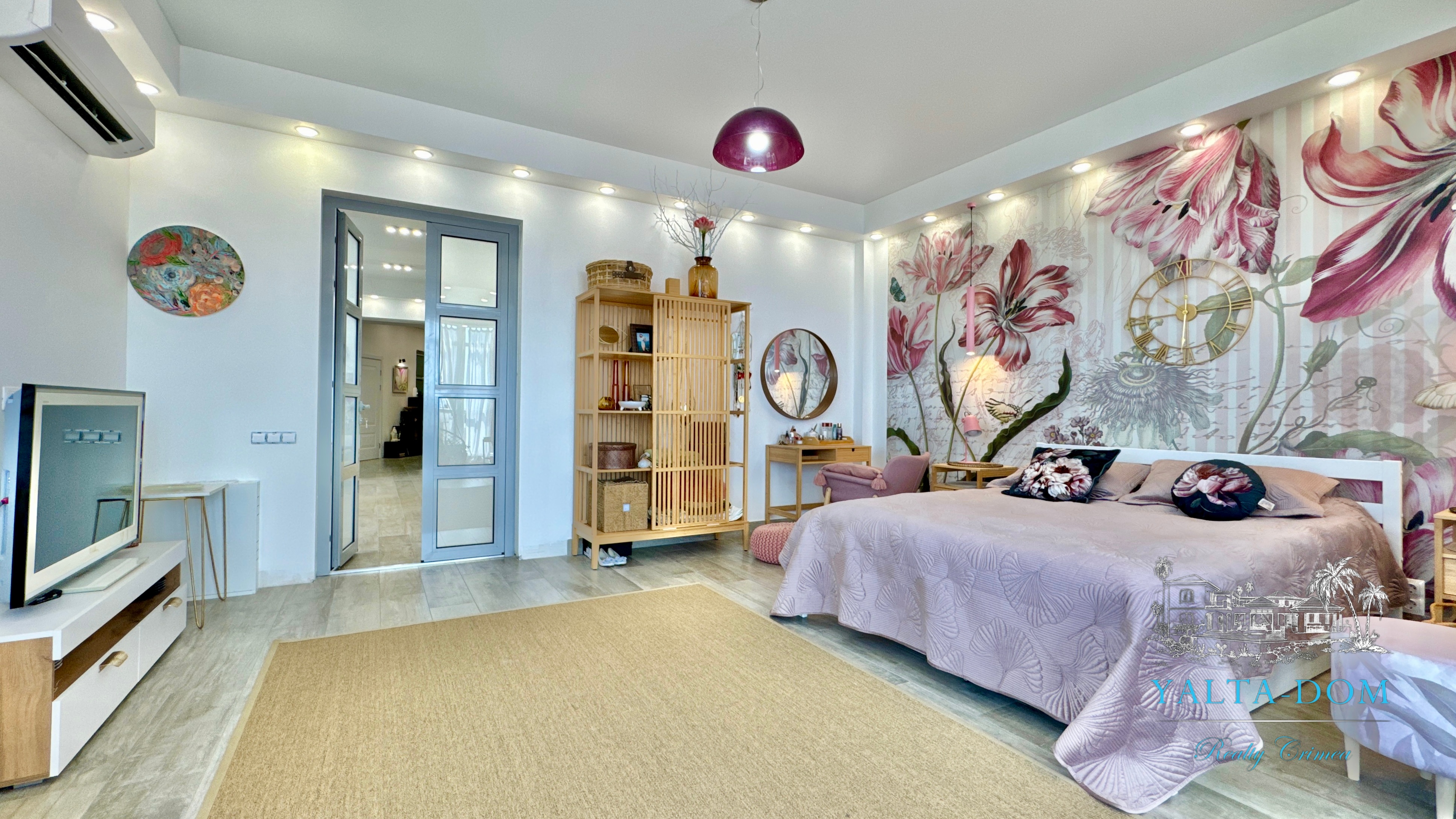 Прихожая с вместительным шкафом, зеркалом, санузел с ванной и стиральной машинкой, санузел гостевой, просторная кухня-гостиная со всем необходимым, вход в спальню, столик для макияжа,TV, кондиционер, двухспальная кровать; зона отдыха с раскладным диваном, кондиционером, панорамным остеклением с видом на море и горы.