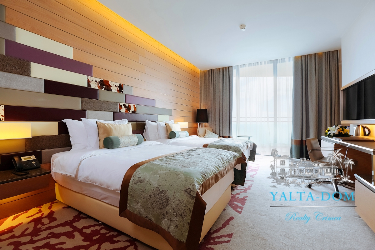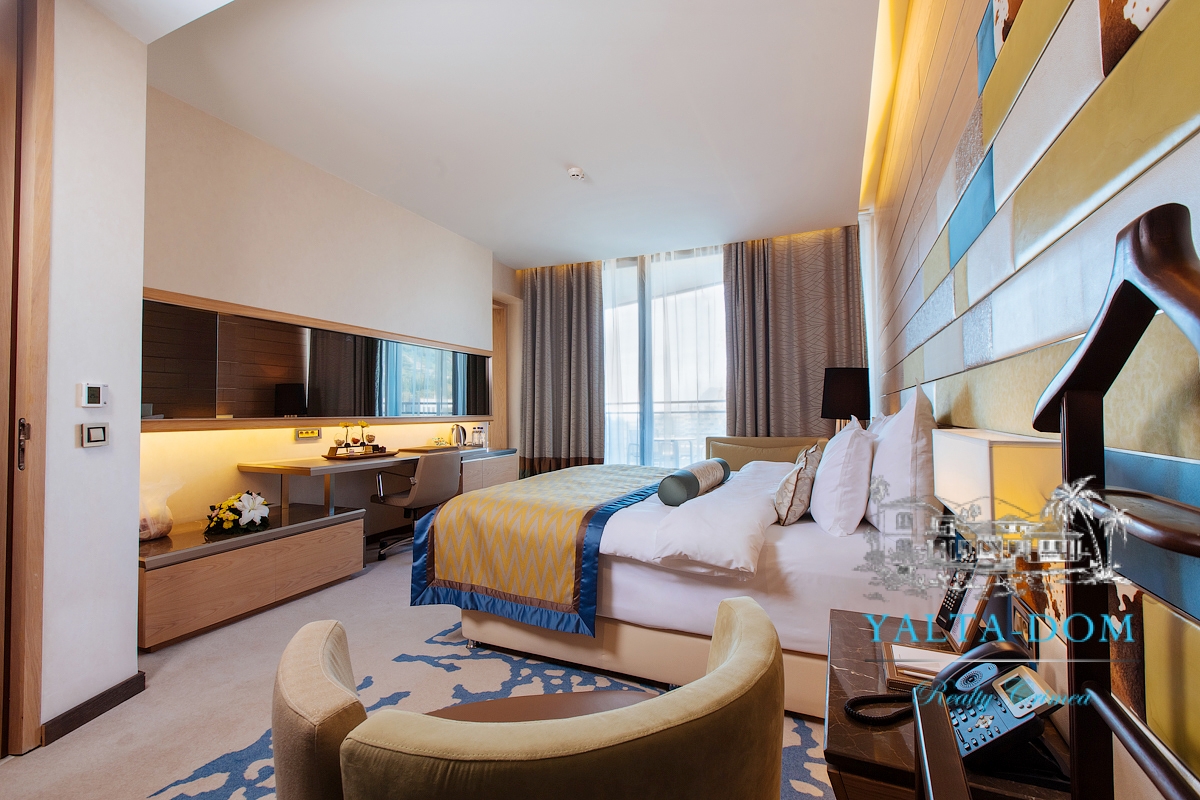 Просторные номера де-люкс площадью 37 м2 располагают всем необходимым для отдыха и максимального комфорта, которому и должен соответствовать номер такой высокой категории. Со вкусом оформленные номера как нельзя лучше подойдут для отдыха после наполненного событиями дня. Здесь все предусмотрено для полноценного проживания гостей, а дизайн впечатляет нетривиальными решениями. Декорированные в натуральных тонах номера с ковровым и мраморным покрытием созданы для приятного отдыха и продуманы до мелочей.