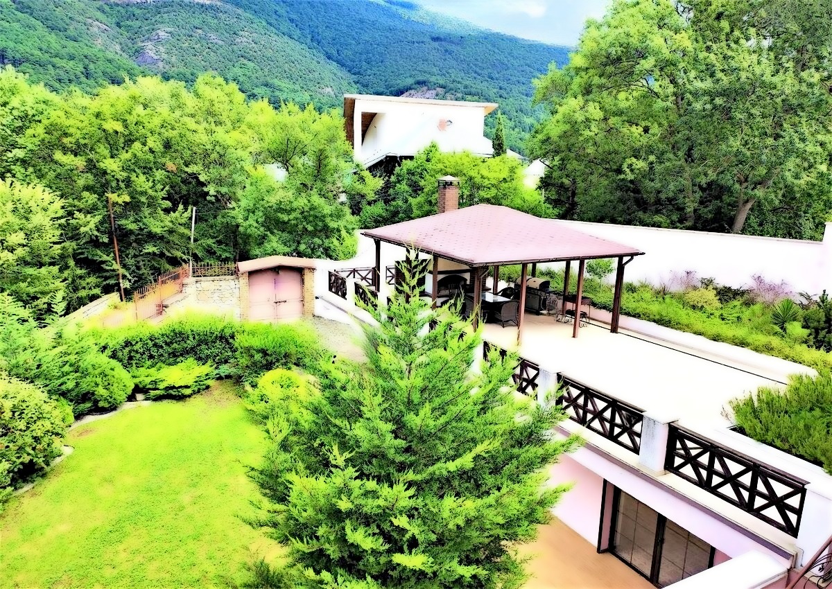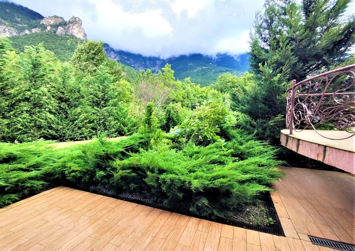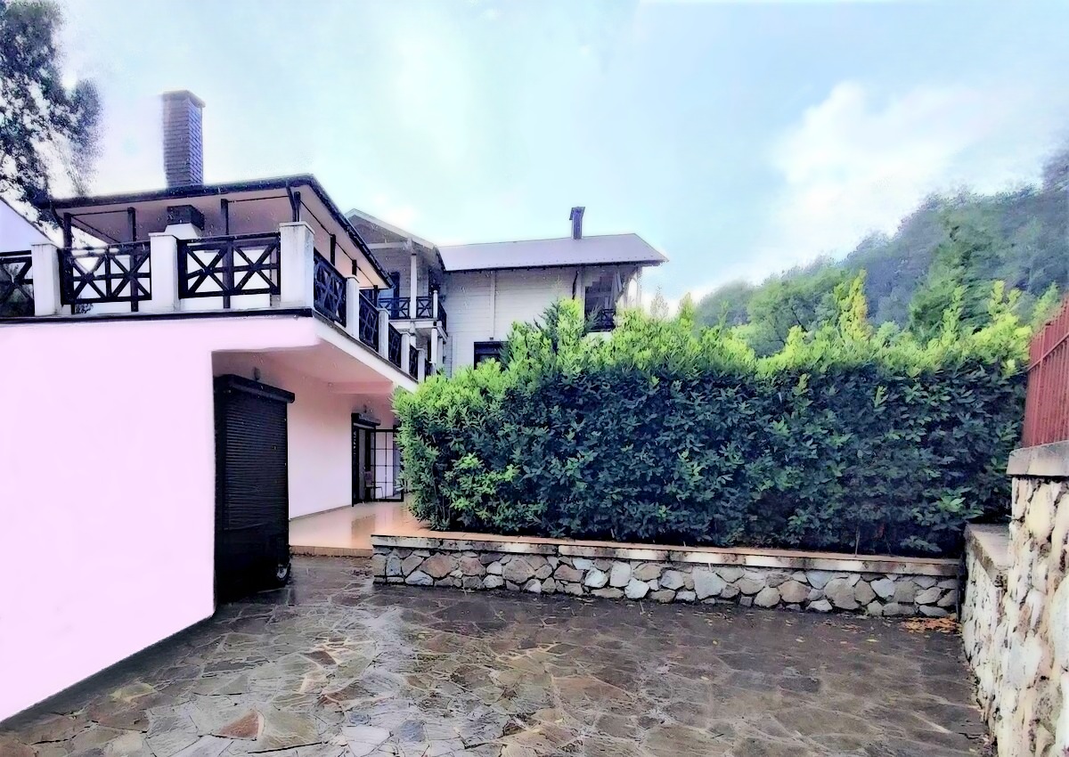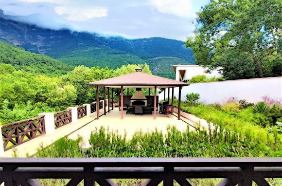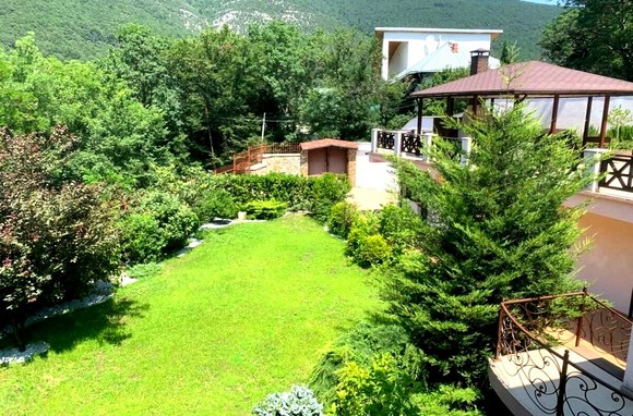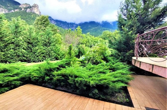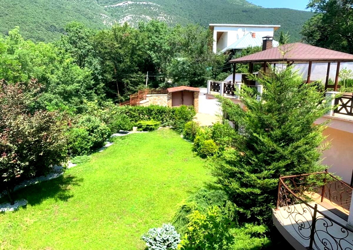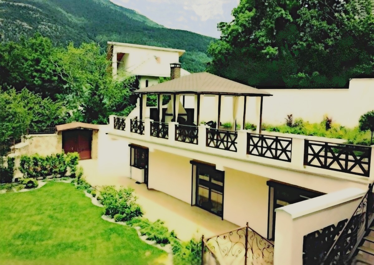Трехэтажная усадьба расположена на участке 12,8 соток, в экологически чистом районе Ялты, в горно-лесном заповеднике, недалеко от знаменитого водопада Учан-су и горной речки. Участок – угловой, с видом на лес, горы и водопад, по периметру - забор из каменной кладки с металлической решеткой сверху; подведены все центральные коммуникации, асфальтированная дорога.