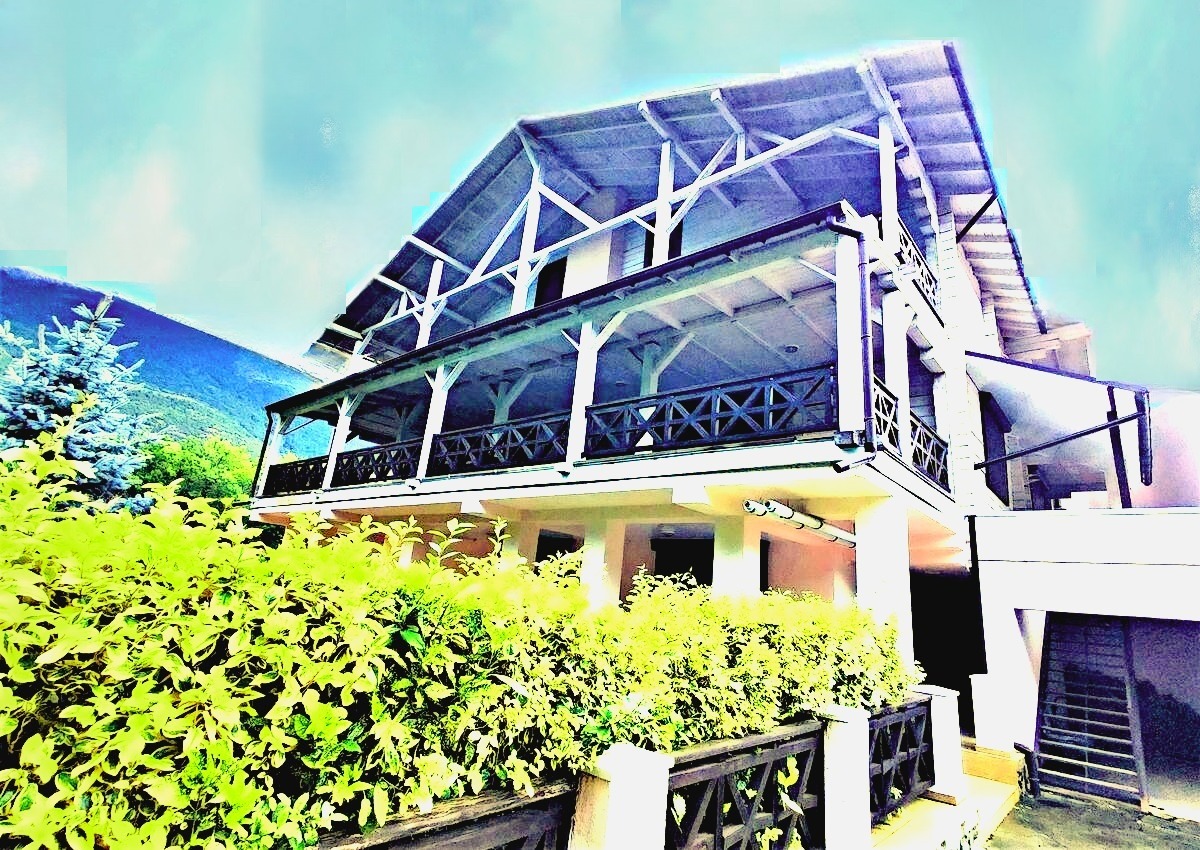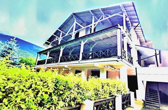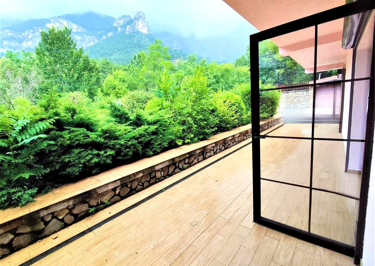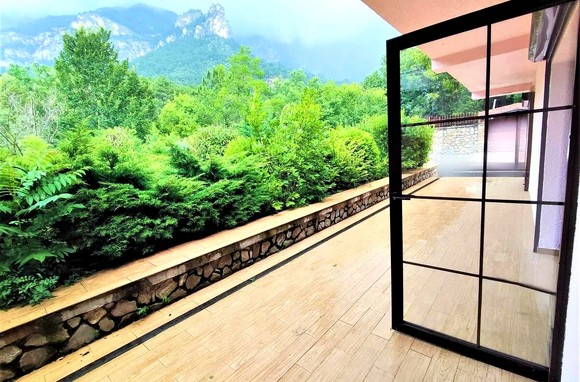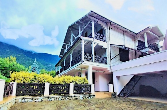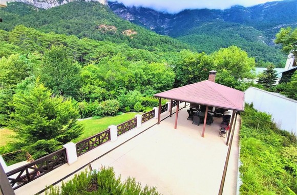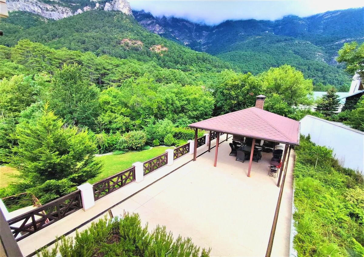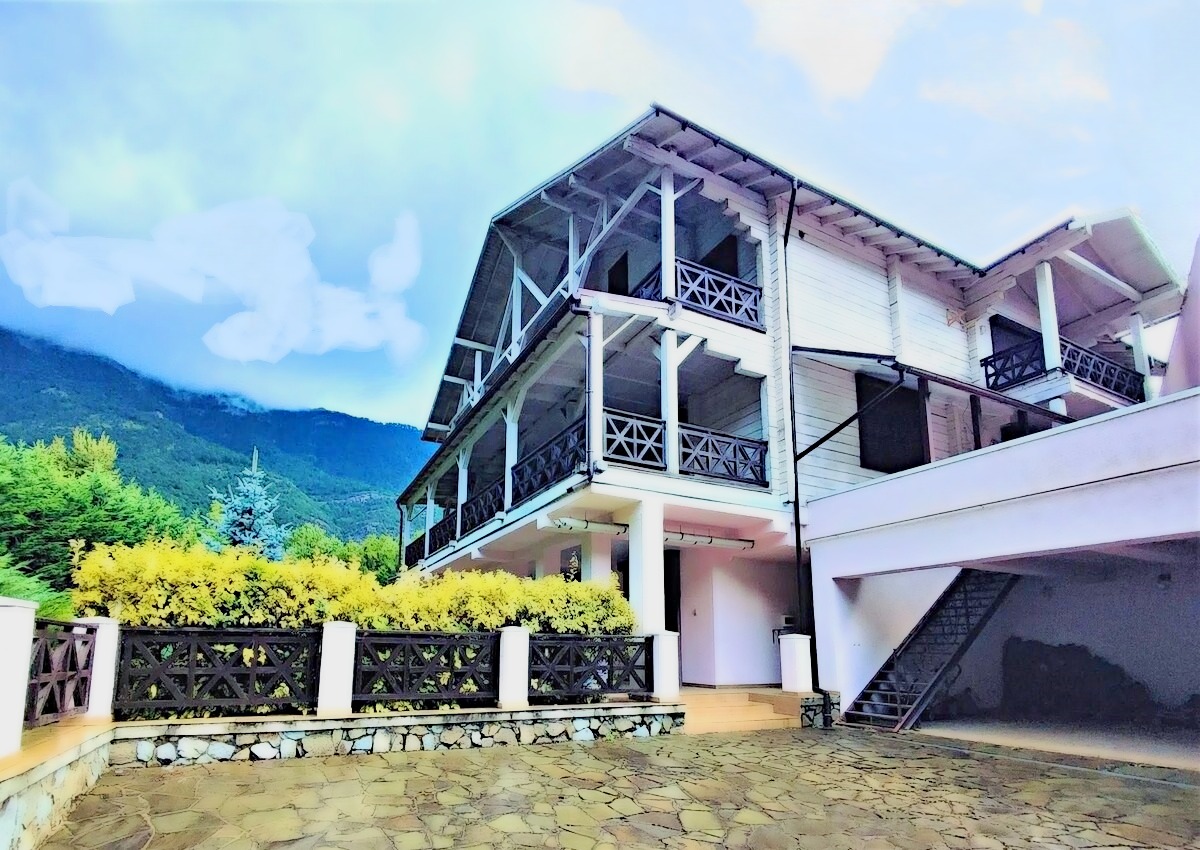 Трехэтажная усадьба расположена на участке 12,8 соток, в экологически чистом районе Ялты, в горно-лесном заповеднике, недалеко от знаменитого водопада Учан-су и горной речки. Участок – угловой, с видом на лес, горы и водопад, по периметру - забор из каменной кладки с металлической решеткой сверху; подведены все центральные коммуникации, асфальтированная дорога.