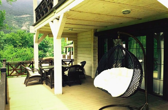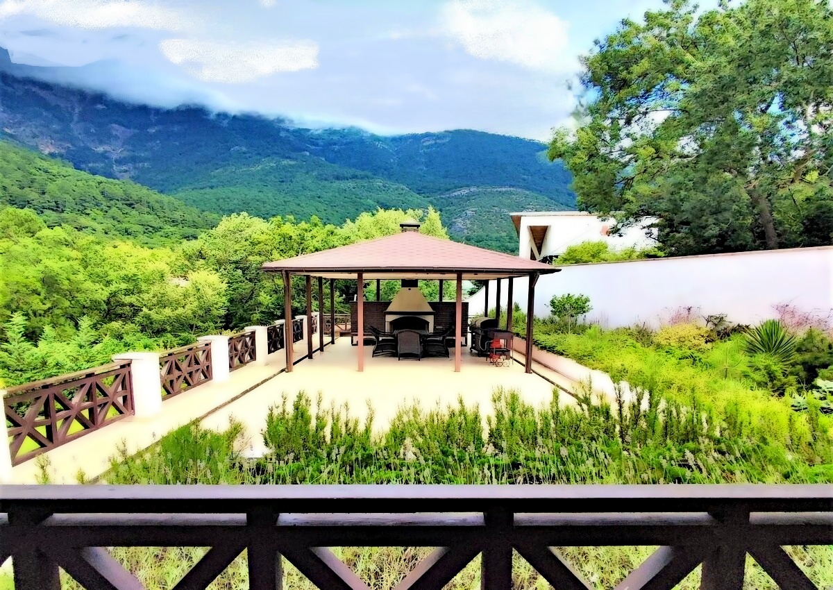 На закрытой территории расположены: гараж на две машины, парковка; гостевой дом с кухней, бильярдной, винным погребом, зоной барбекю с крытой беседкой с садовой мебелью и панорамными видами на крымскую природу