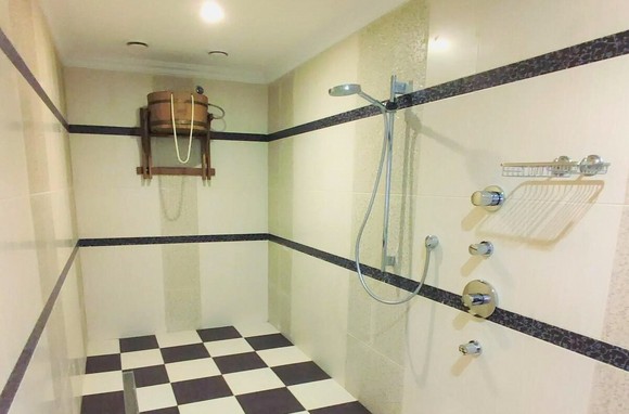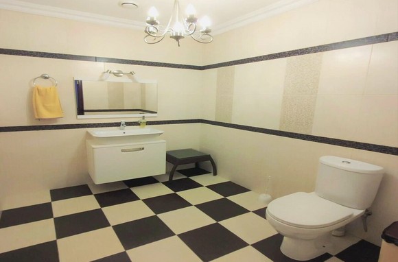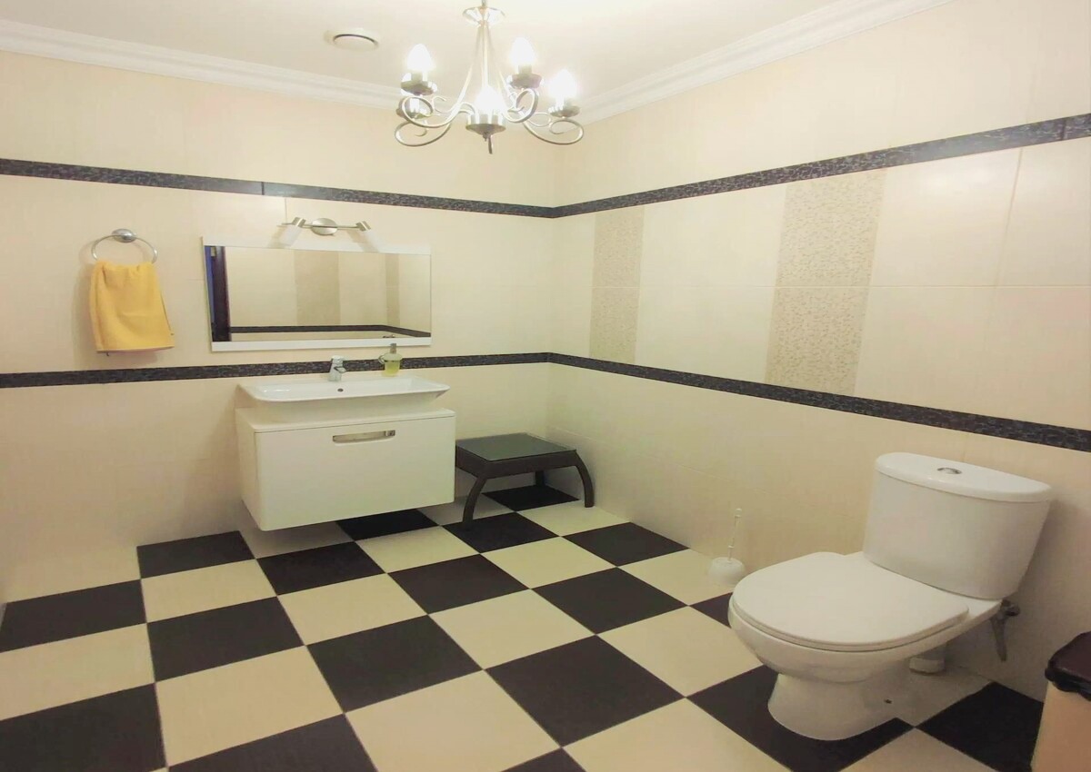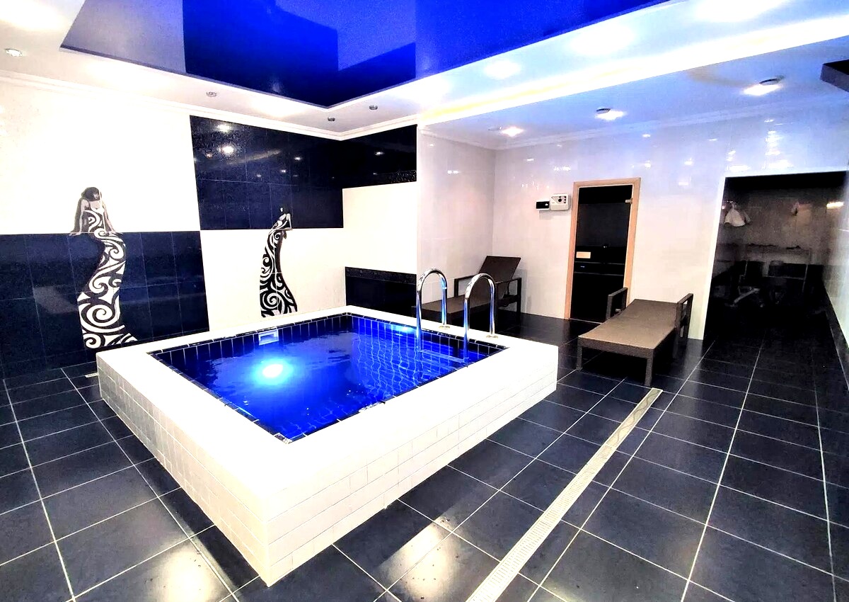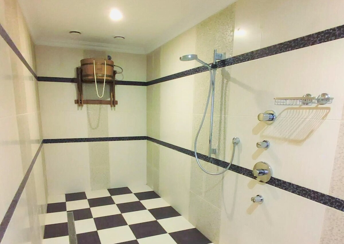 Первый этаж – железобетонная сейсмоустойчивая конструкция, в которой расположены - общая зона: спа-комплекс: душевая, с/у, сауна с купелью, выход в сад; спорткомплекс; кладовые; небольшой холл с внутренними лестницами в каждую из двух частей дома.