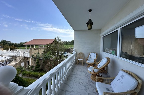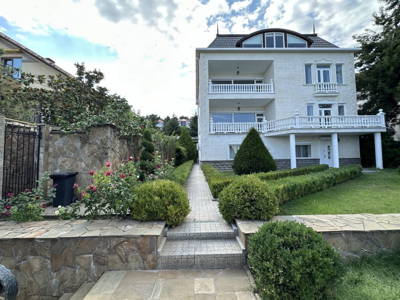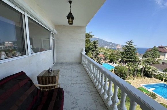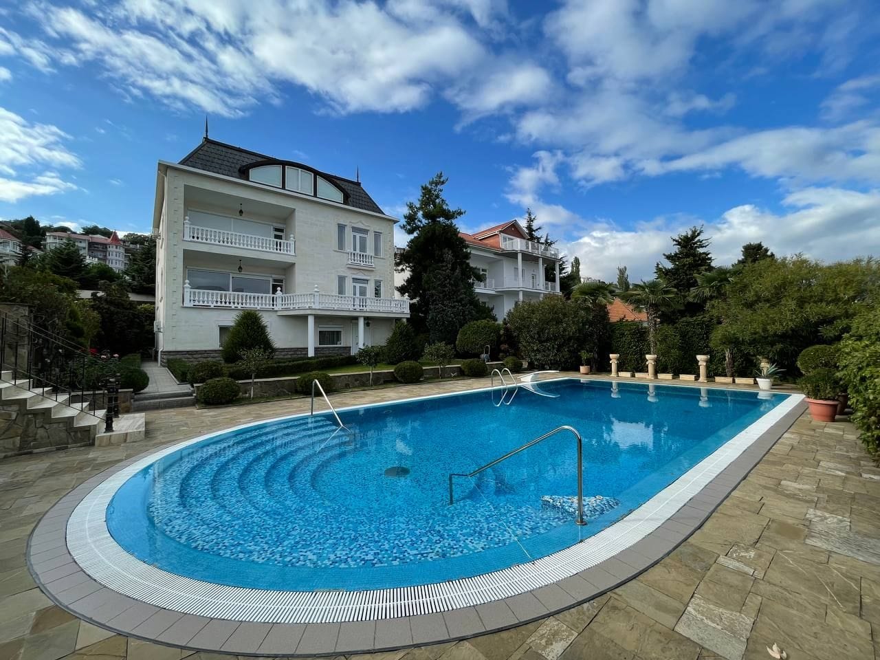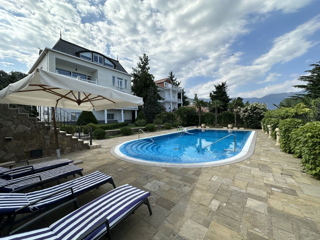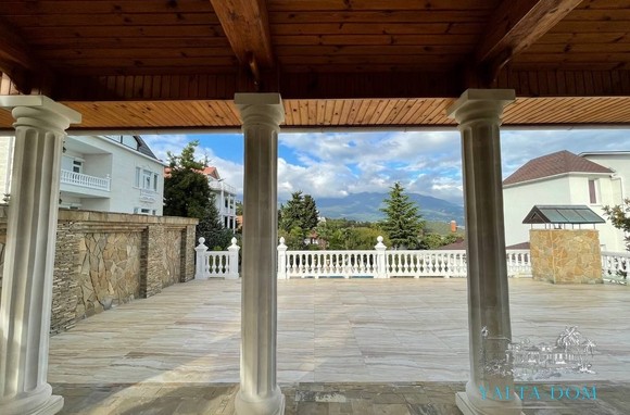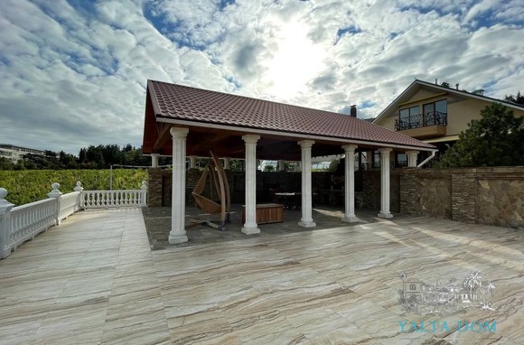 На участке 10 соток находится два строения, дом общей площадью 626 кв/м, отдельное строение включает в себя гараж на 2 автомобиля, бойлерную, зону бильярда, сауну с зоной отдыха, винный погреб, гостевую кухню, два сан узла, видовую крытую террасу с которой открывается вид на горы, море и виноградники.