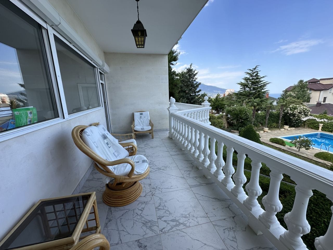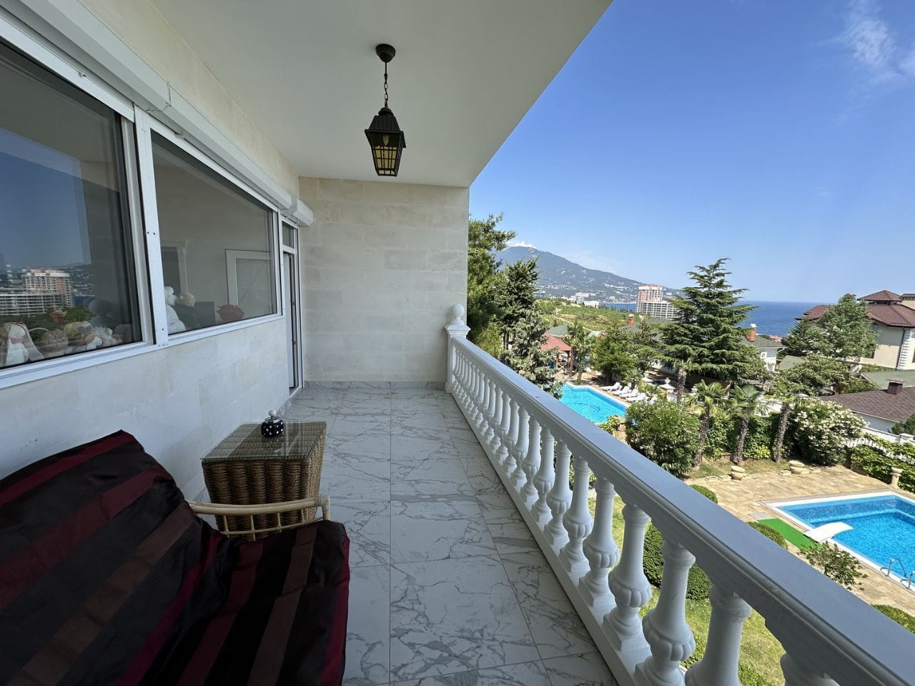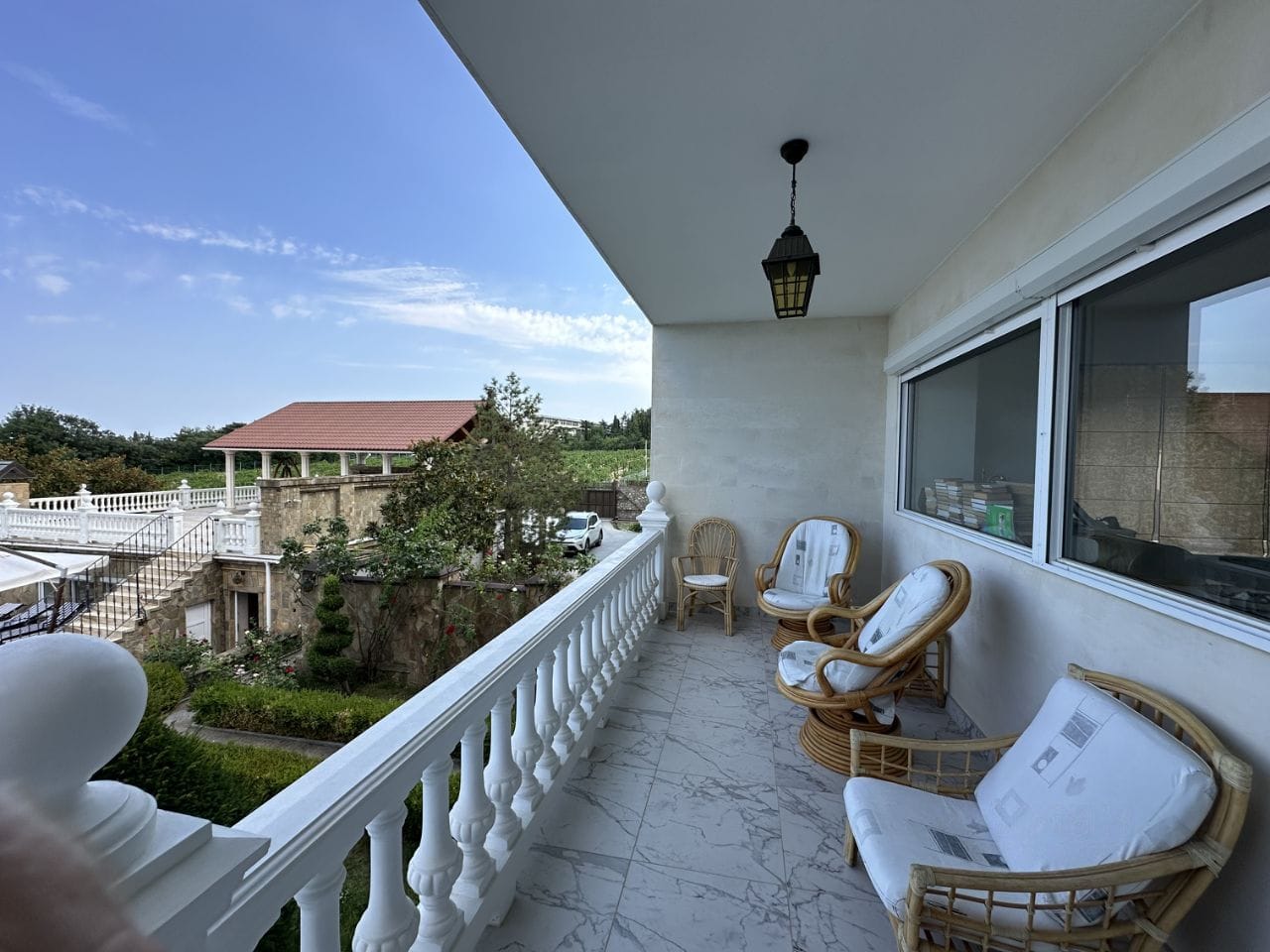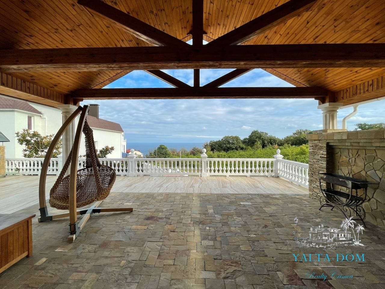 На участке 10 соток находится два строения, дом общей площадью 626 кв/м, отдельное строение включает в себя гараж на 2 автомобиля, бойлерную, зону бильярда, сауну с зоной отдыха, винный погреб, гостевую кухню, два сан узла, видовую крытую террасу с которой открывается вид на горы, море и виноградники.