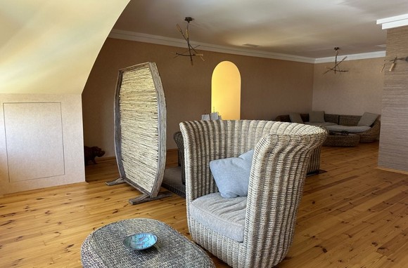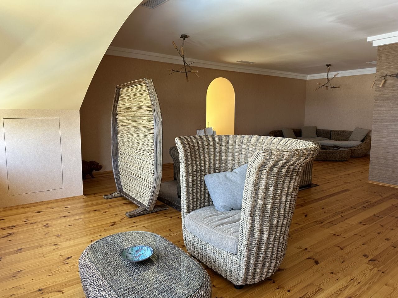 Четвертый этаж: общая зона отдыха. Пространство с диванами и гардеробными.