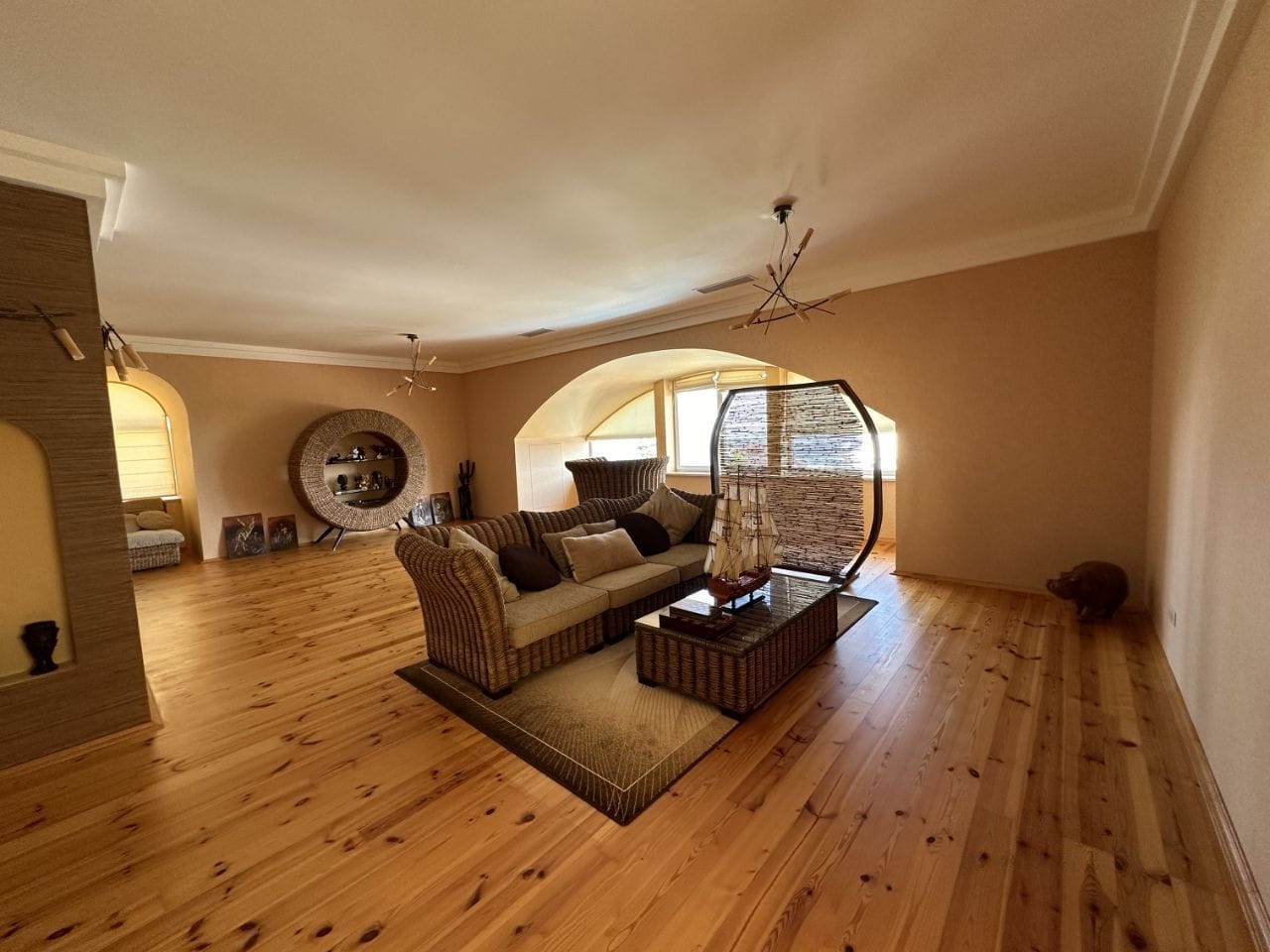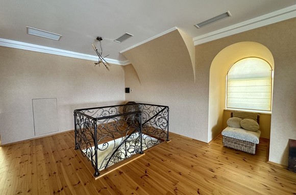 Первый этаж: три спальни, два полноценных сан. узла, прихожая, два отдельных выхода (парадная дверь и задний ход)